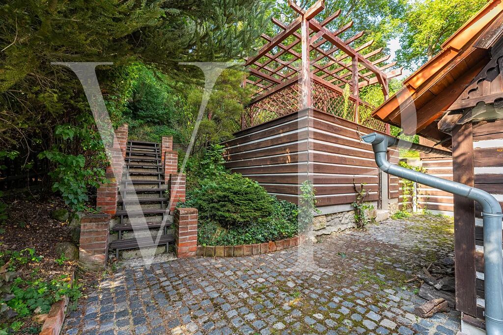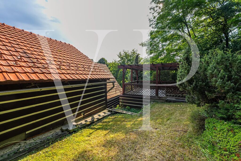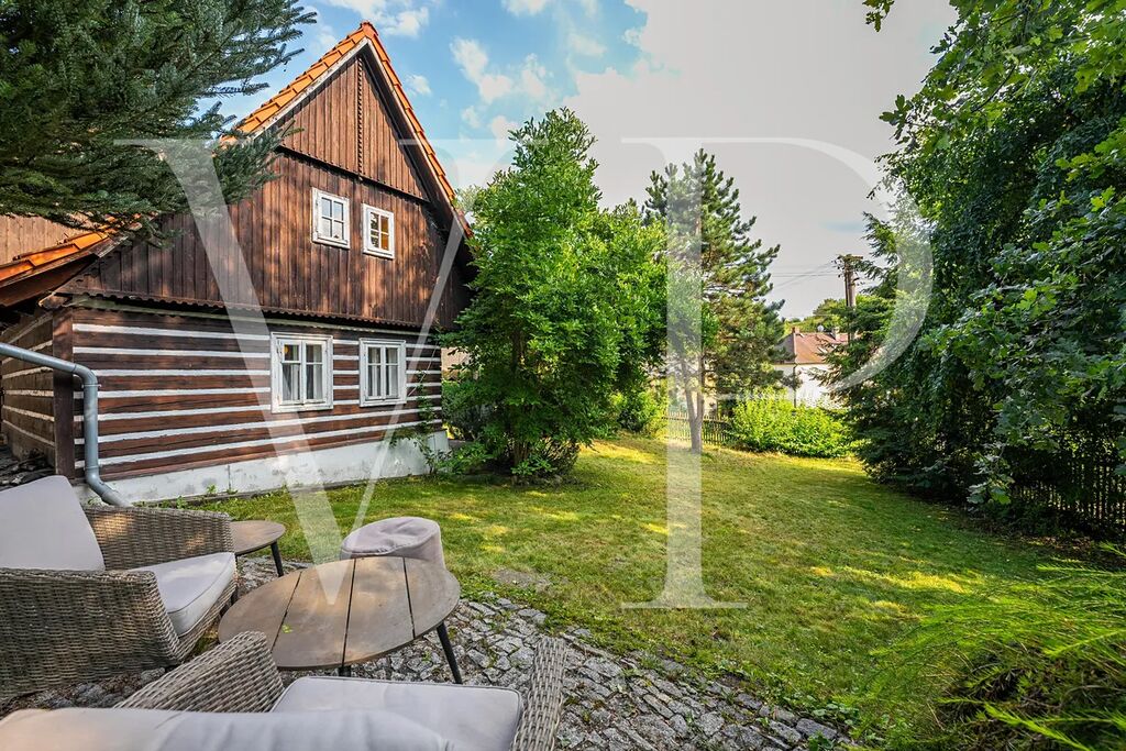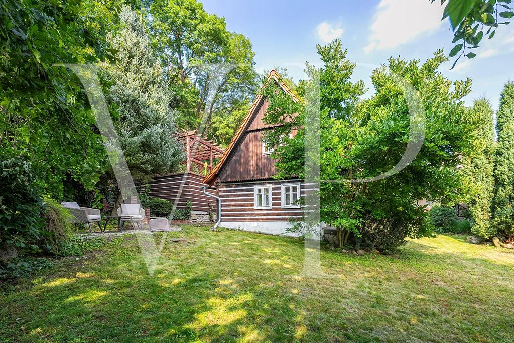 Na udržované zahradě se vzrostlými stromy a keři narazíme na spoustu příjemných zákoutí. Za chalupou ve svahu stojí kůlna s pergolou.