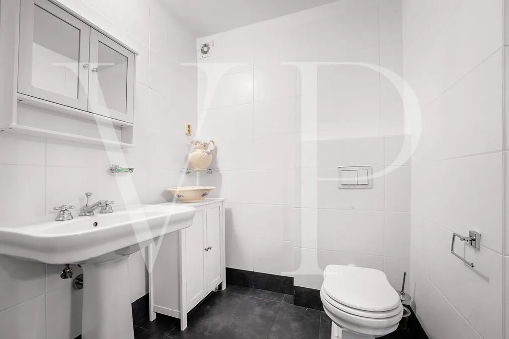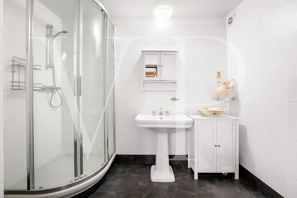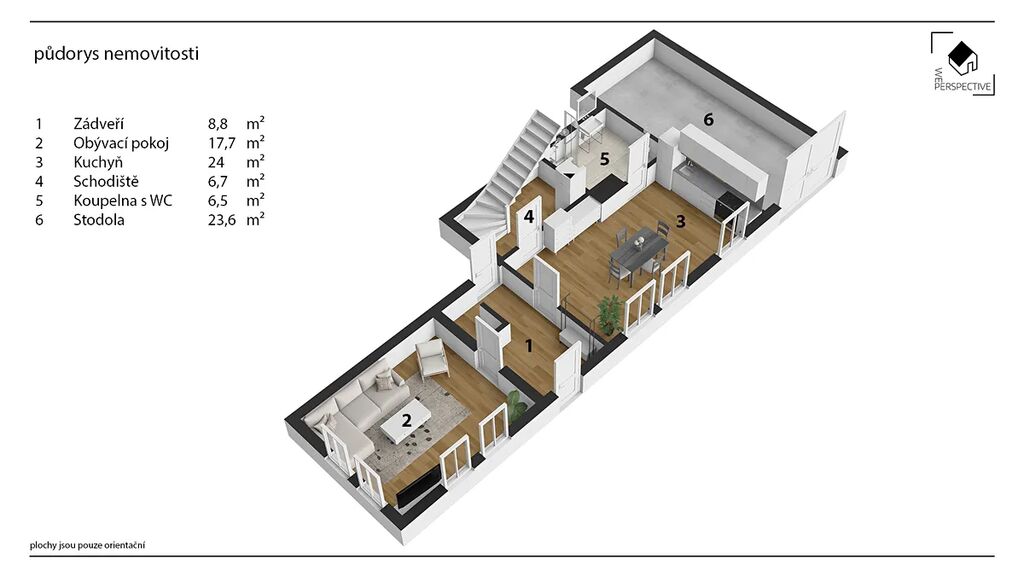 V přízemí se nachází vstupní chodba (8,8 m²) a obývací pokoj (17,7 m²), stylová na míru dělaná kuchyně s vestavěnými spotřebiči (24 m²), koupelna se sprchovým koutem a toaletou (6,5 m²) a vstup po dřevěných schodech do patra.