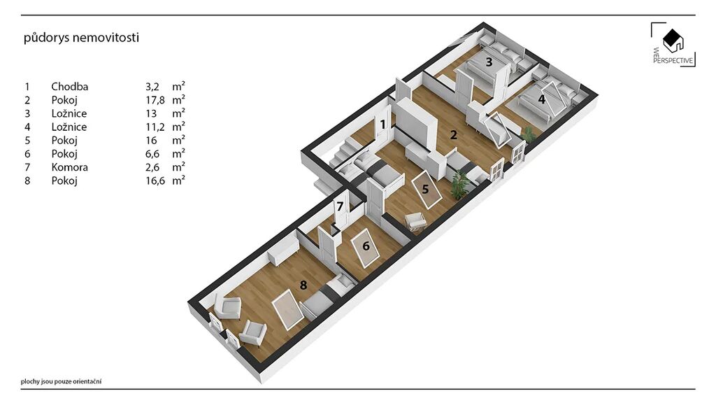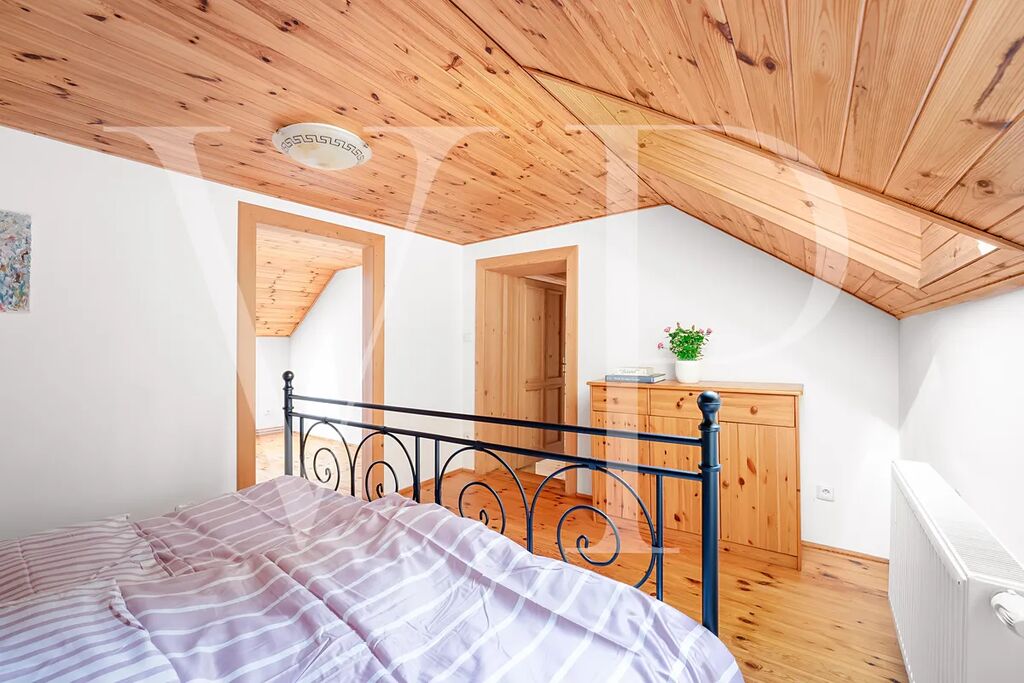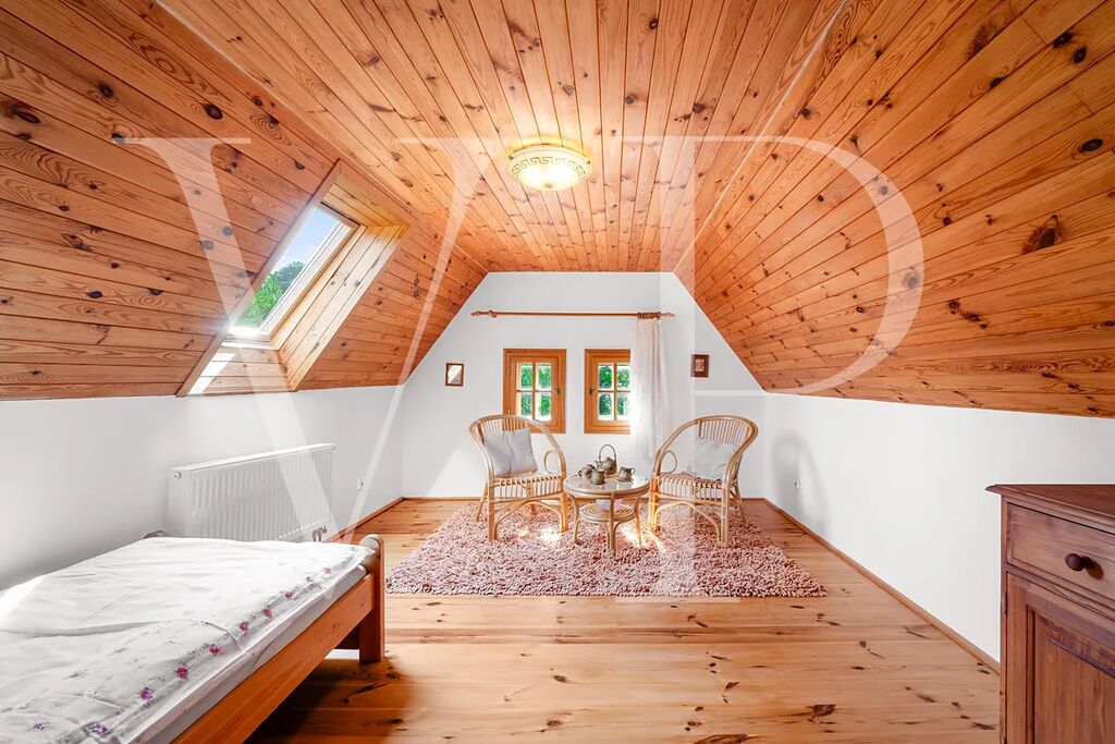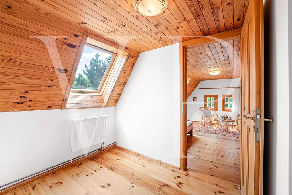 V patře se dále nachází 5 útulných světlých ložnic, pokoj vhodný například pro pracovnu nebo šatnu a malinká komora.