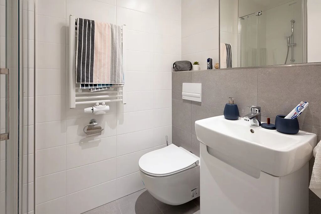 ✔️ Moderní koupelna se sprchou – toaleta, umyvadlo se zrcadlem a další úložné prostory
