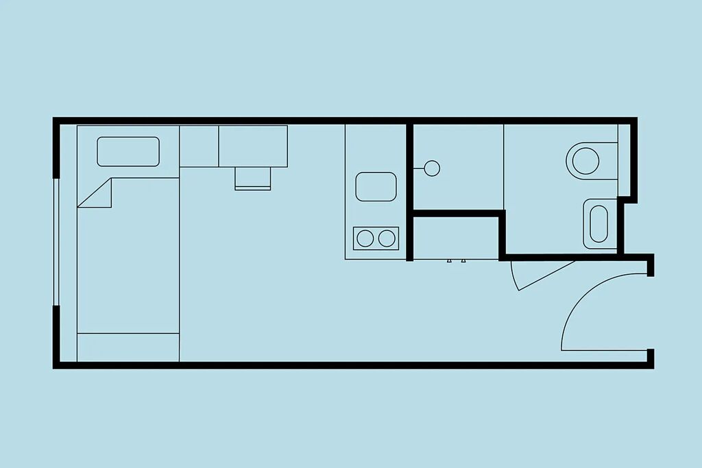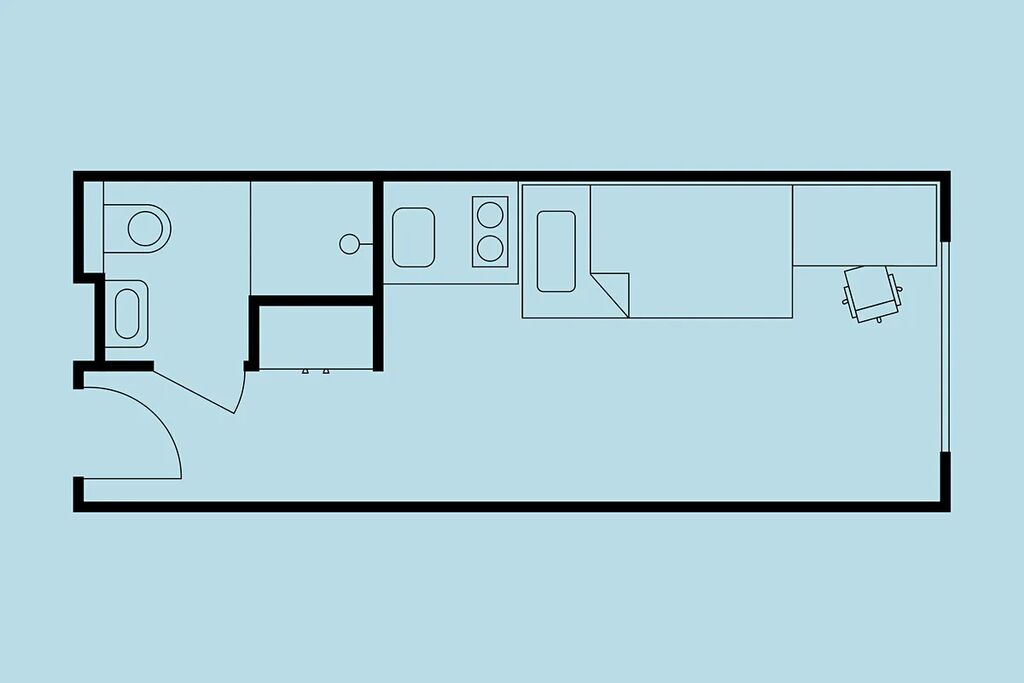 ✔️ Obývací a pracovní zóna – postel s matrací, pracovní stůl a židle, šatní skříň, zatemňovací závěsy, interkom a spousta úložného prostoru