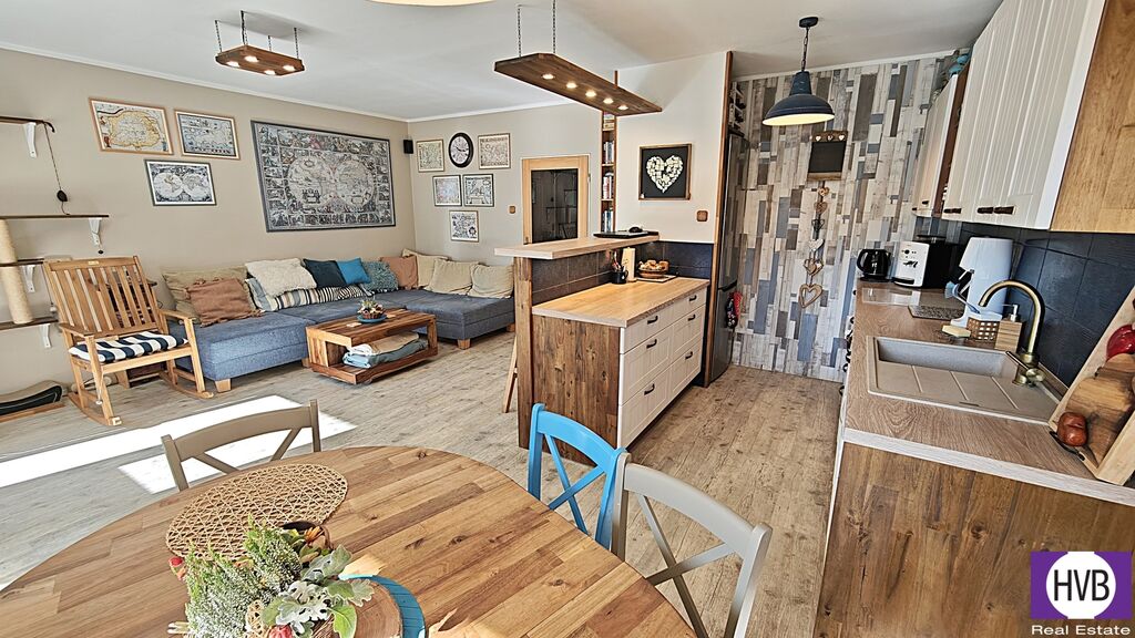Dispozice nabízí prostorný obývací pokoj s moderně zařízenou kuchyní a jídelním koutem, 3 pokoje, koupelnu s WC, předsíň, komoru a lodžii.
