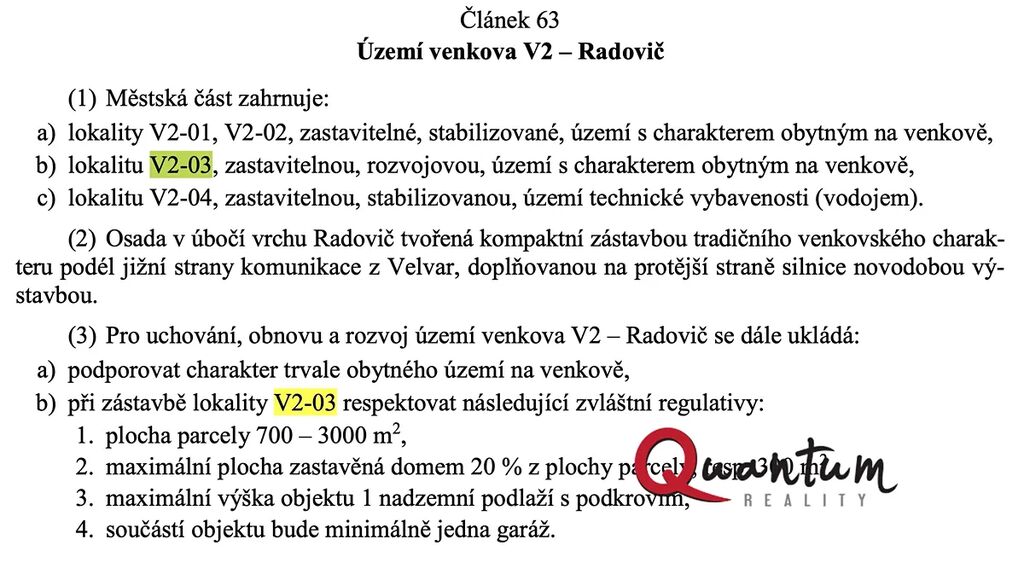 Územním plánem je pozemek zařazen pod plochy V2 -03, tedy území venkova rozvojovou část se zastavitelností 20%, kdy rodinný dům se sedlovou střechou může disponovat jedním nadzemním podlažím a podkrovím, součástí stavby musí být garáž.