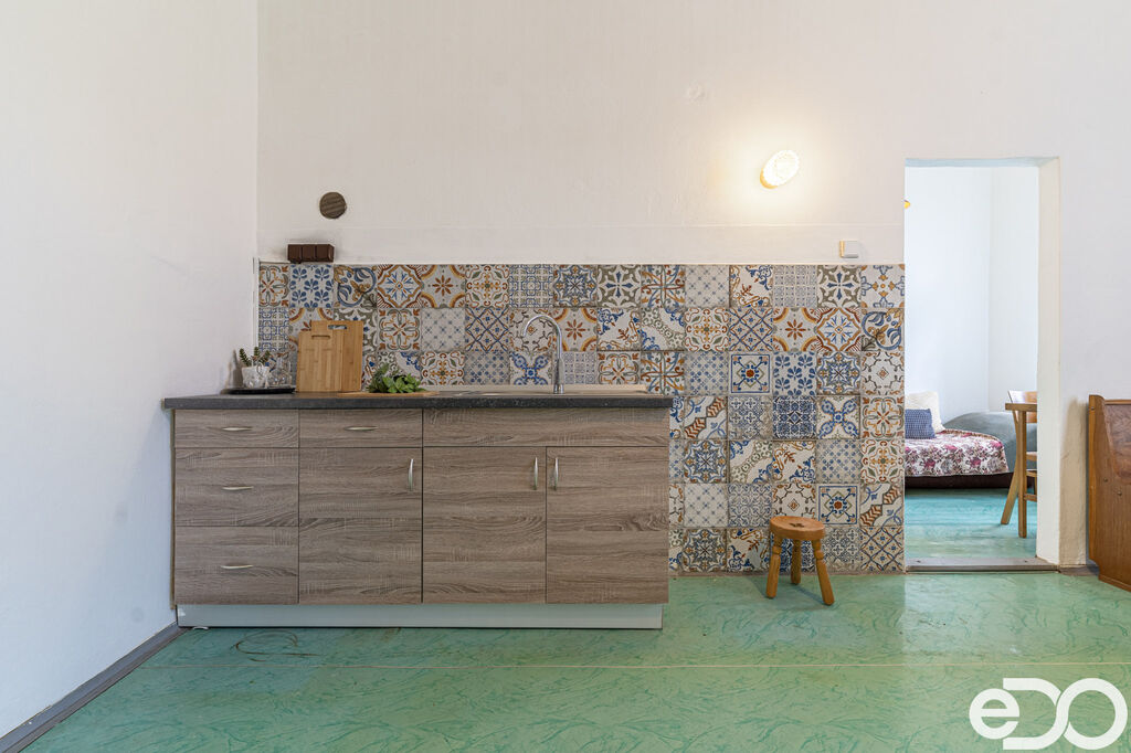 Dispozice: po vstupu do předsíně je vpravo samostatné WC. Dále chodbou vpravo kuchyně s velkou spižírnou. Na konci chodby vstup do ložnice, vlevo do obývacího pokoje. Mezi ložnicí a kuchyní je menší místnost využívaná jako pracovna, z níž je přístupná koupelna. Tyto dva prostory odděluje dřevěná příčka; v Prohlášení vlastníka jsou vedeny společně jako „lázně“. K bytu náleží velmi prostorný sklep v suterénu. Před domem je možnost rezidentního parkování. Za domem se nachází městský pozemek, který je nyní využíván jako oplocená společná zahrada.