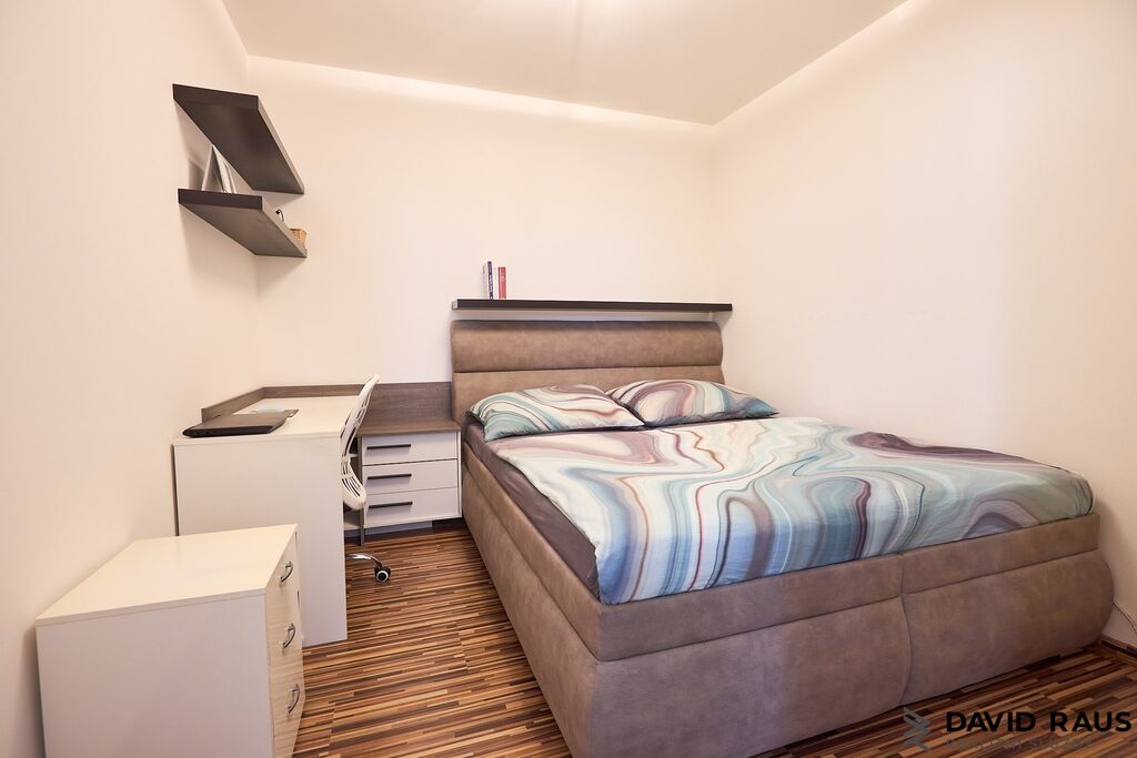 Po vstupu do bytu se ocitnete v prostorné chodbě (10,32 m²), kde je po levé straně umístěna vestavěná otevřená skříň s bohatým úložným prostorem a po pravé straně vestavěná šatní skříň se zrcadlem doplněná o nástěnné věšáky. Již při vstupu je patrné, že byt nabízí dostatek místa pro pohodlné a přehledné uspořádání věcí. Z chodby se vstupuje přímo do obývacího pokoje s kuchyňskou linkou (24,99 m²), který tvoří srdce celého bytu. Odtud vedou dveře do ložnice (9,2 m²) a dětského pokoje(9,06 m²), přičemž z obývacího i dětského pokoje je umožněn přístup na terasu navazující na předzahrádku, ideální pro odpočinek nebo rodinné posezení. Součástí dispozice je samozřejmě i koupelna (4,82 m²) a samostatná toaleta (1,65 m²).