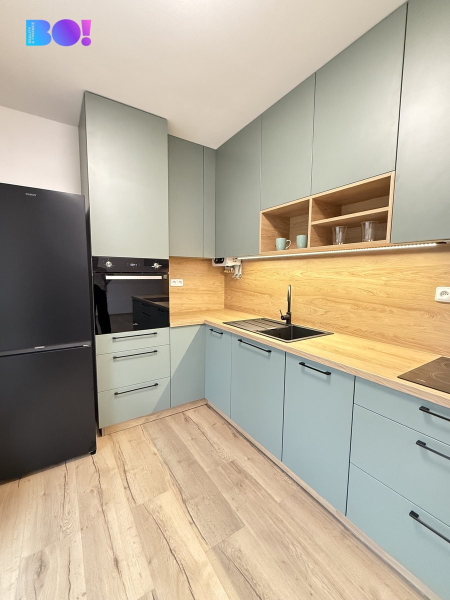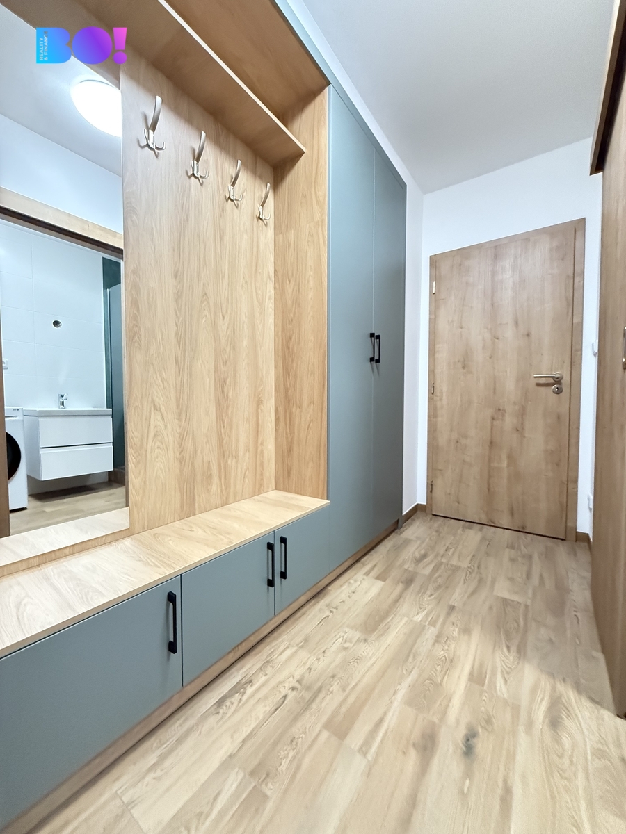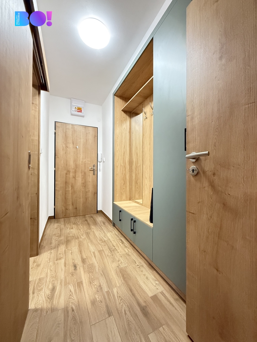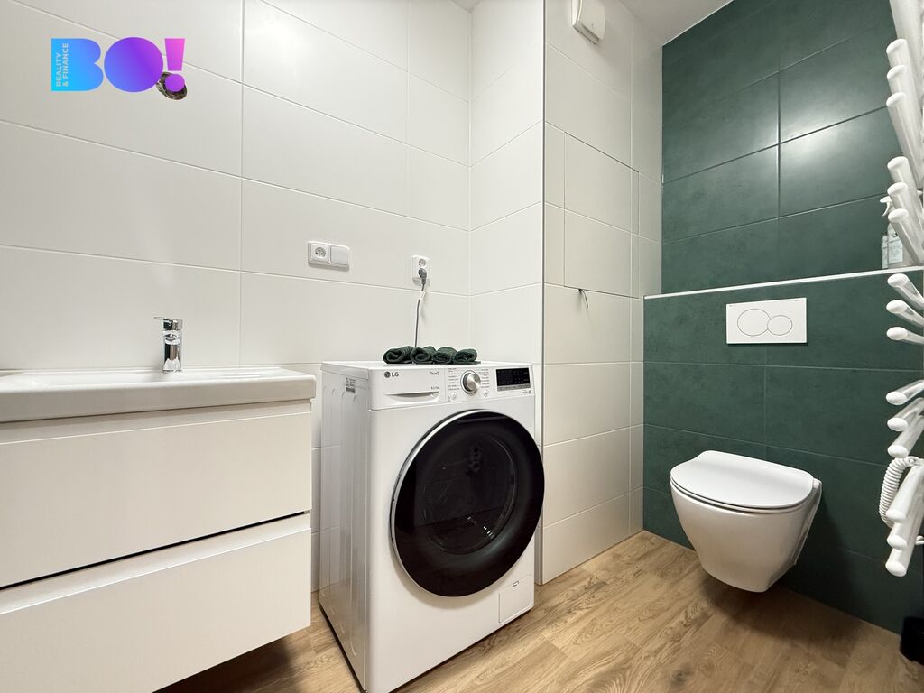 Byt disponuje velkou koupelnou se sprchovým koutem a novou pračkou, šatní skříní v předsíni, která svými materiály a barevným laděním navazuje i na prostornou kuchyňskou linku, takže vše působí velmi harmonicky. Obývací prostor je spojen s kuchyní z níž je výstup a prostornou lodžii. Celý tento prostor je orientován směrem k lesu, takže vůbec nemáte pocit, že jste ve městě.
