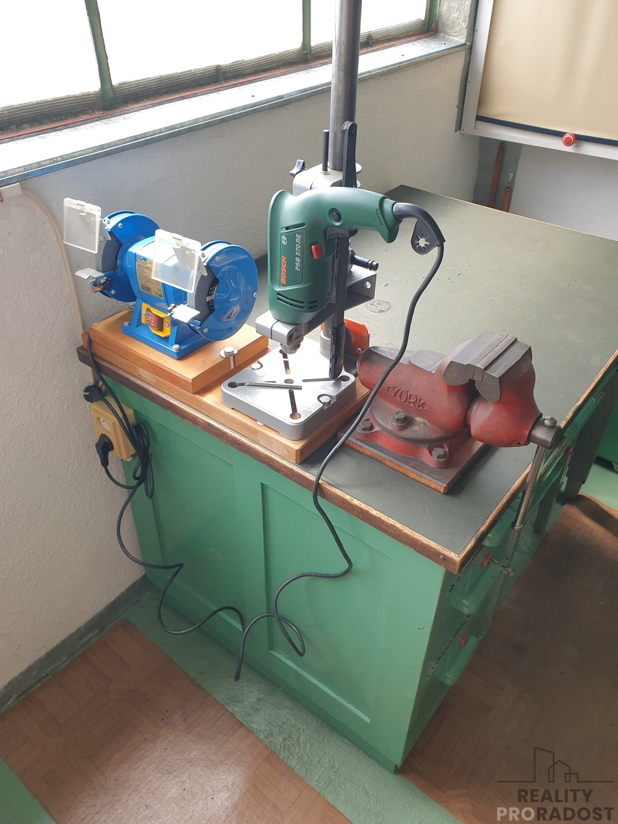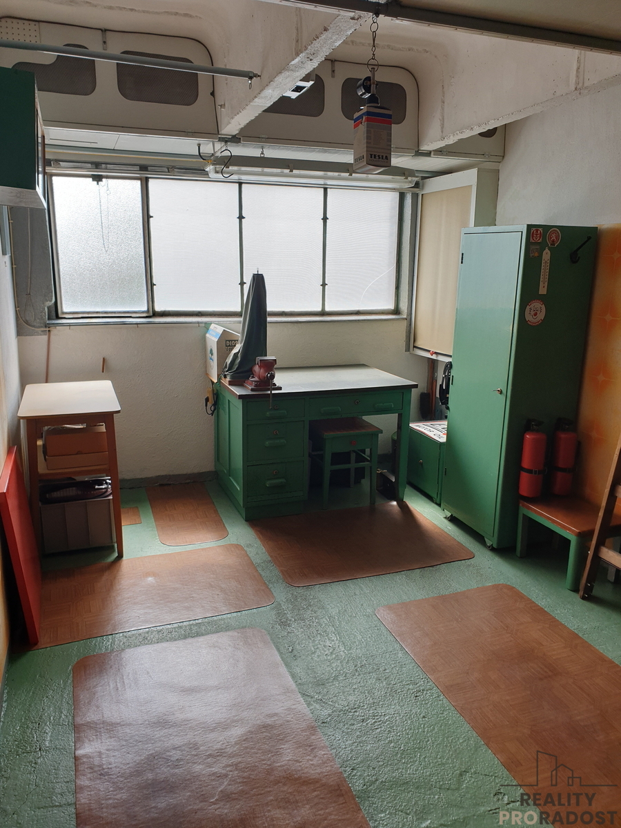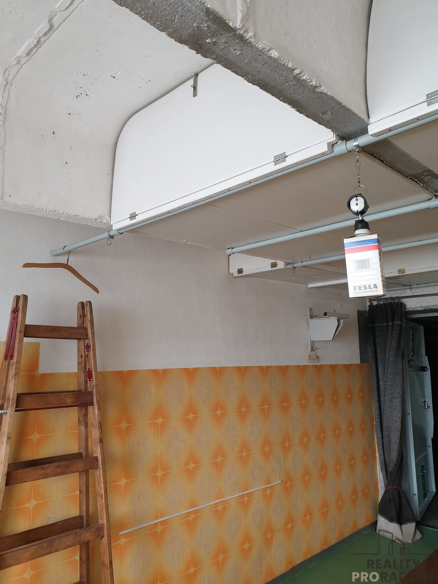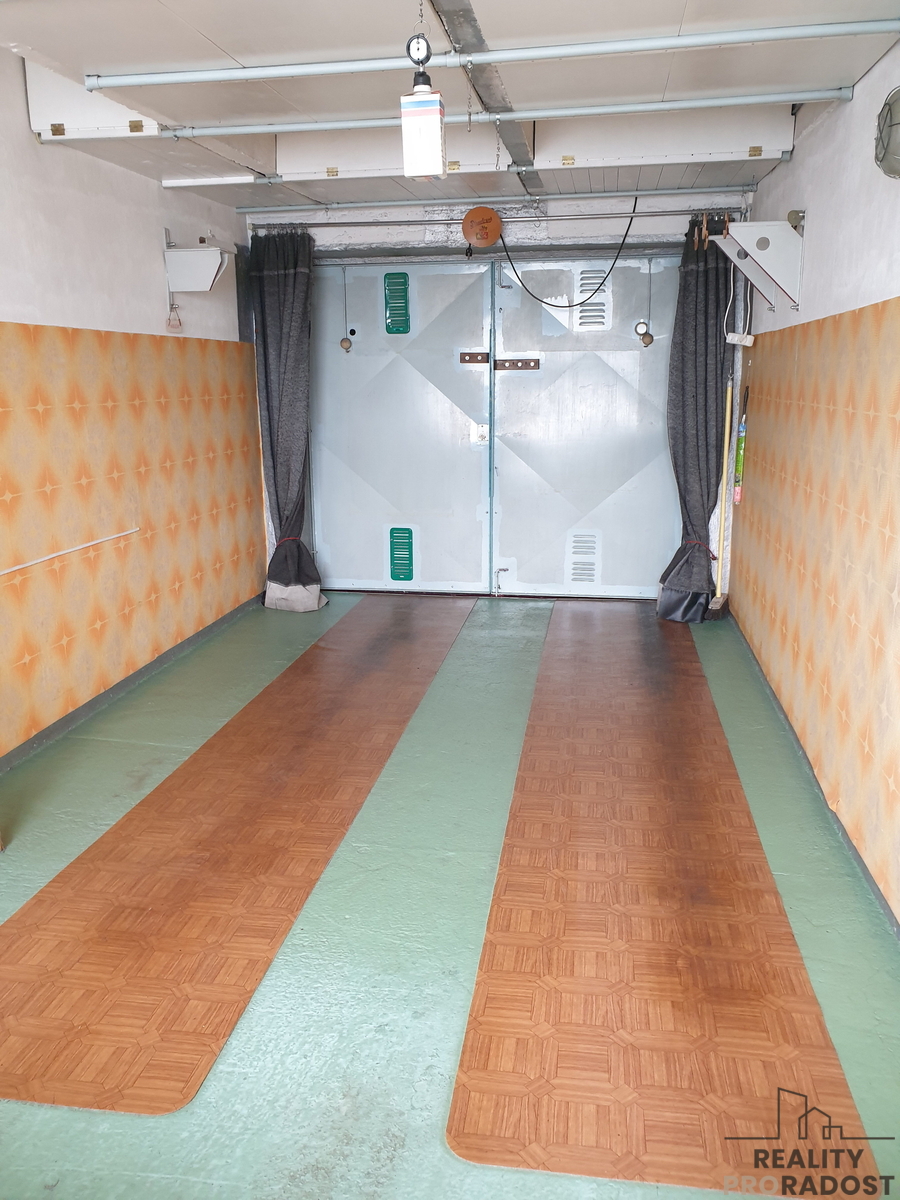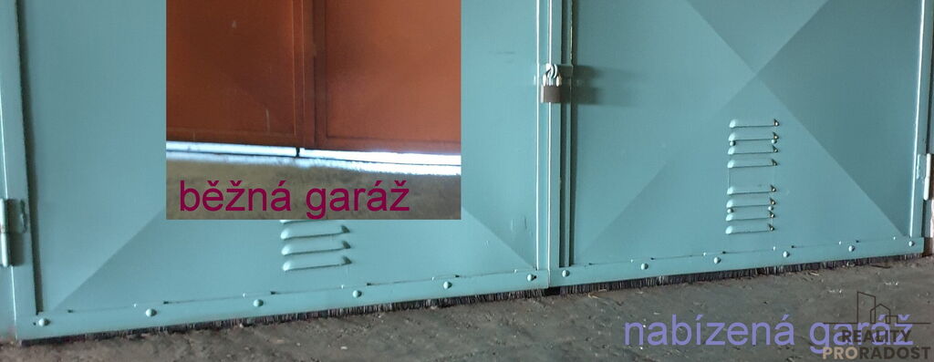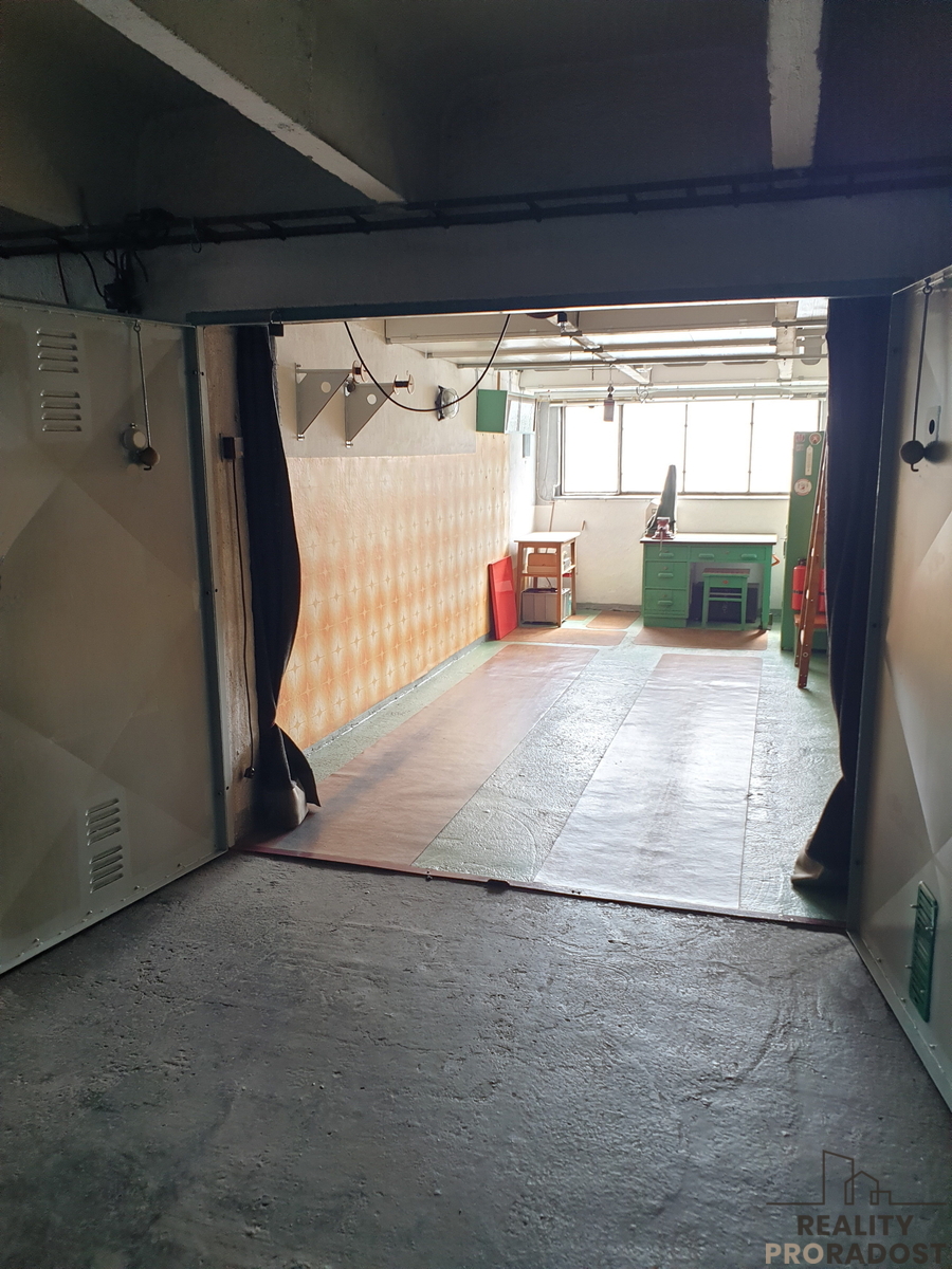 Vlastní garáž se nachází ve 2 1/2 patře. s několikanásobně jištěnými vraty. Vedle vrat je na chodbě zásuvka na 230 V s možností obsluhy prostoru garáže a vypínač osvětlení garáže. Garáž má rovněž dobré světelné podmínky jak přirozeného osvětlení ( velké okno), tak i umělého. Součástí prodeje je vybavení garáže - pracovní stůl, skříňky a poličky. Příslušenstvím je základní strojní vybavení, různé sady nářadí a spojovacího materiálu. V garáži je velké množství úložných prostor. Půdorys garáže je 5,99x 2,83 m2, užitná plocha 17 m2. Garáž je ve velmi dobrém stavu. Prodává ji původní majitel -stavebník. Platby spojené s užíváním jsou ve výši zhruba 3.500 Kč ročně. Garáž je v družstevním vlastnictví s možností převedení osobního vlastnictví.