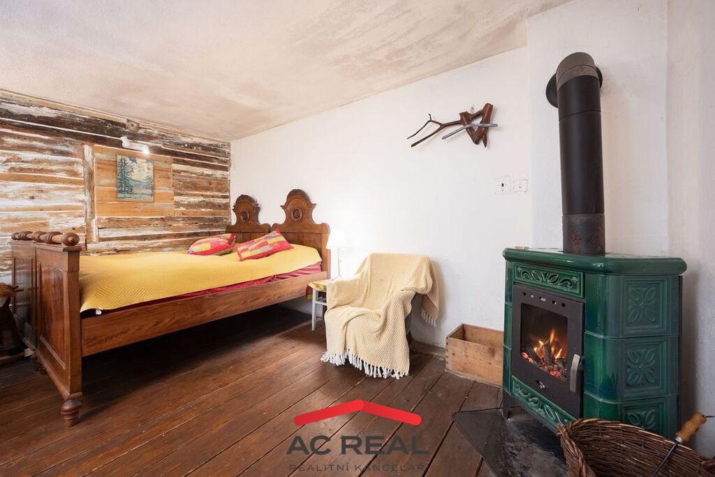 • Kuchyně propojená s obývacím pokojem, který zároveň slouží jako manželská ložnice s krbovými kamny