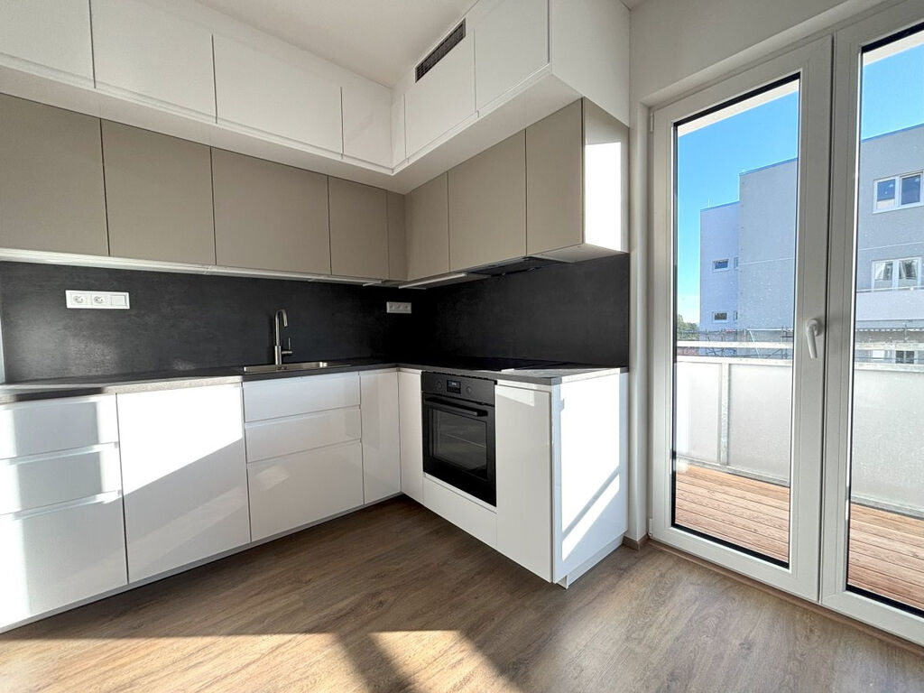 Kuchyňský kout disponuje indukční varnou deskou, elektrickou troubou a kombinovanou lednicí s mrazákem. Z prostoru kuchyňského koutu je vstup na první balkon.
