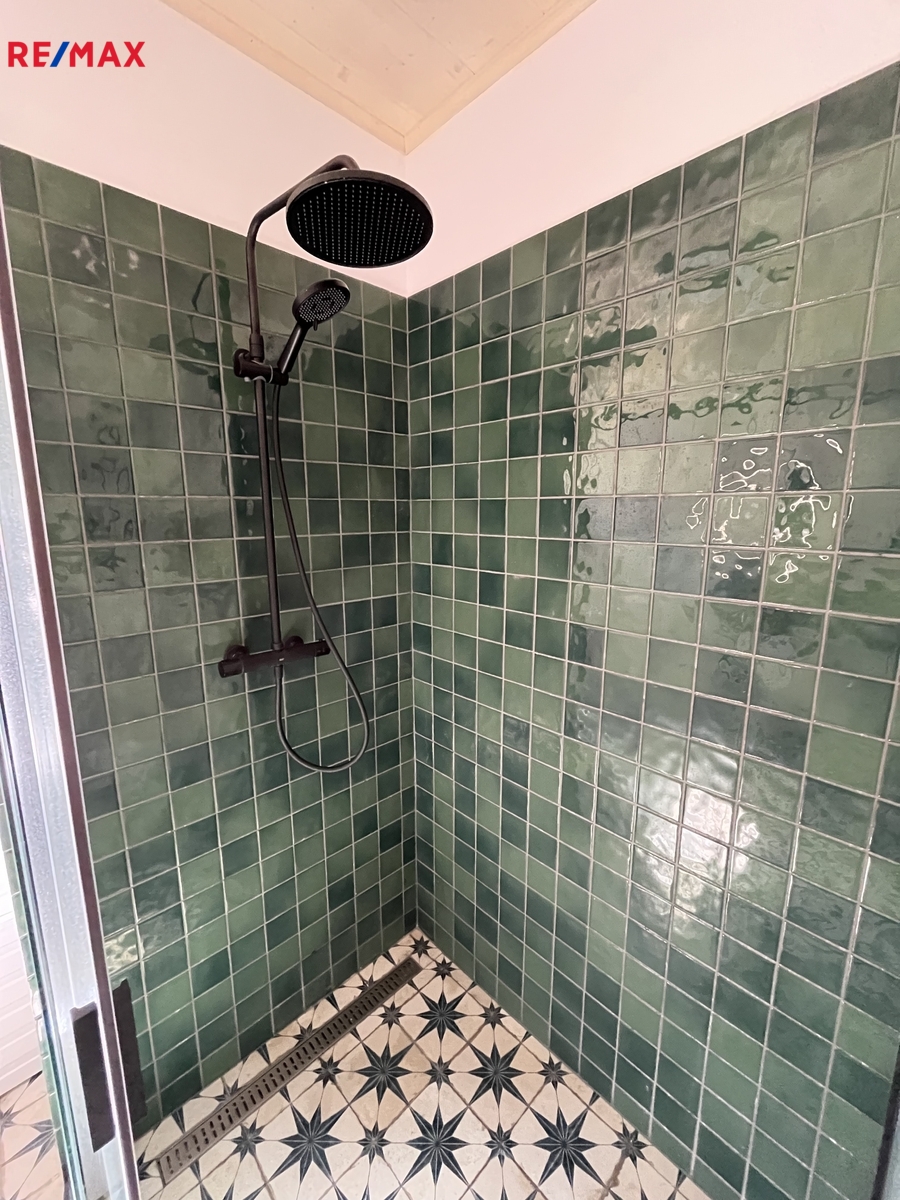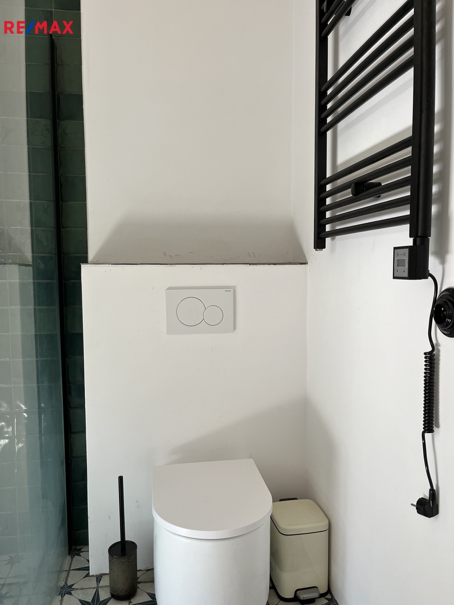 Moderní koupelna se sprchovým koutem a WC – útulné a praktické řešení.