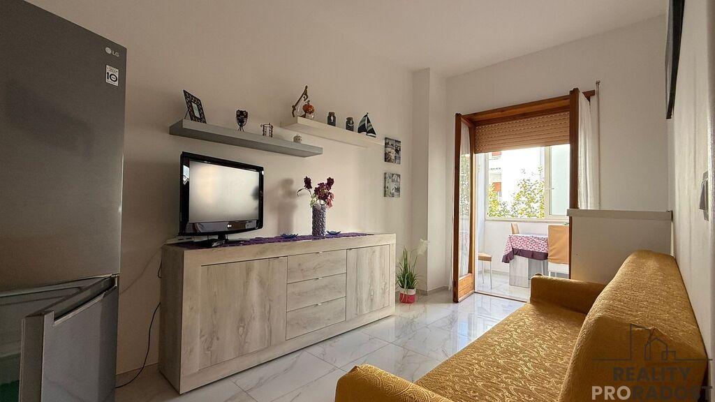 Byt je prakticky řešený – kuchyň je samostatná a situovaná v zasklené otevírací terase, která poskytuje prostor pro snídani s výhledem na moře nebo večerní relaxaci. Obývací pokoj je světlý a prostorný, k dispozici je hlavní ložnice s manželskou postelí a menší pokoj vhodný například jako dětský pokoj či pracovna. Moderní koupelna se sprchovým koutem doplňuje pohodlné zázemí.