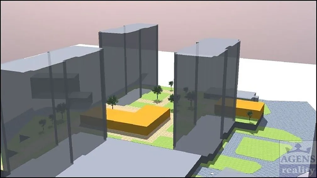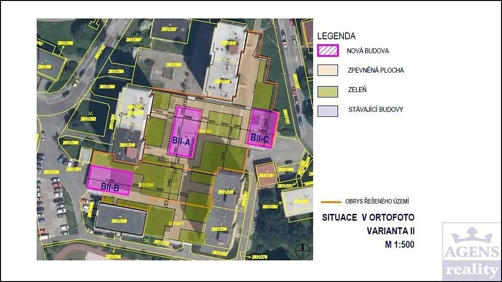 Na menším pozemku o výměře 1.242m2 má vzniknout stavba o půdorysu 252m2 a na větším pozemku o výměře 2.711m2 má vzniknout alternativně buď 1 stavba o půdorysu 534m2, a nebo 2 stavby o půdorysech 288m2 a 216m2 (tj. celkem o půdorysu 504m2). Situace staveb a vizualizace jejich umístění na pozemcích jsou přiloženy. Další informace a podklady na dotaz v kanceláři.