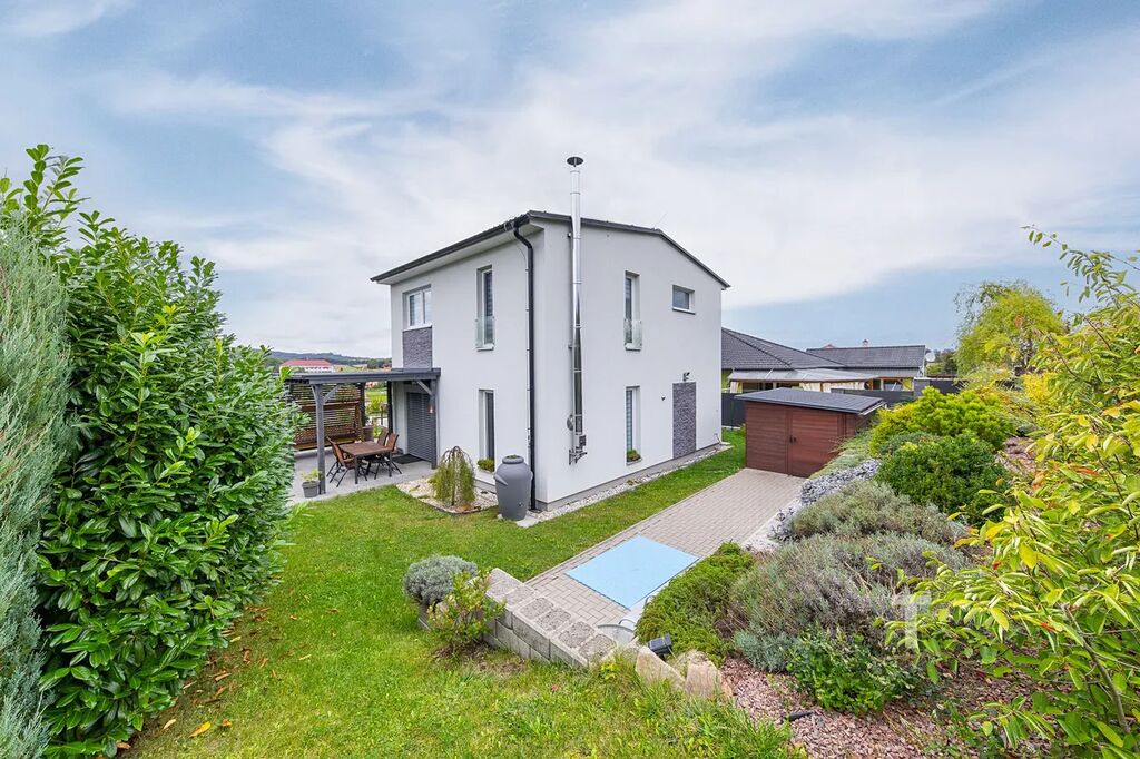 Pozemek o výměře 689 m² je upravený – zpevněné chodníky, terasa s pergolou, opěrná zeď, závětří u vstupu, oplocení. Součástí je také projekt na garáž pro dvě auta a další parkovací stání.