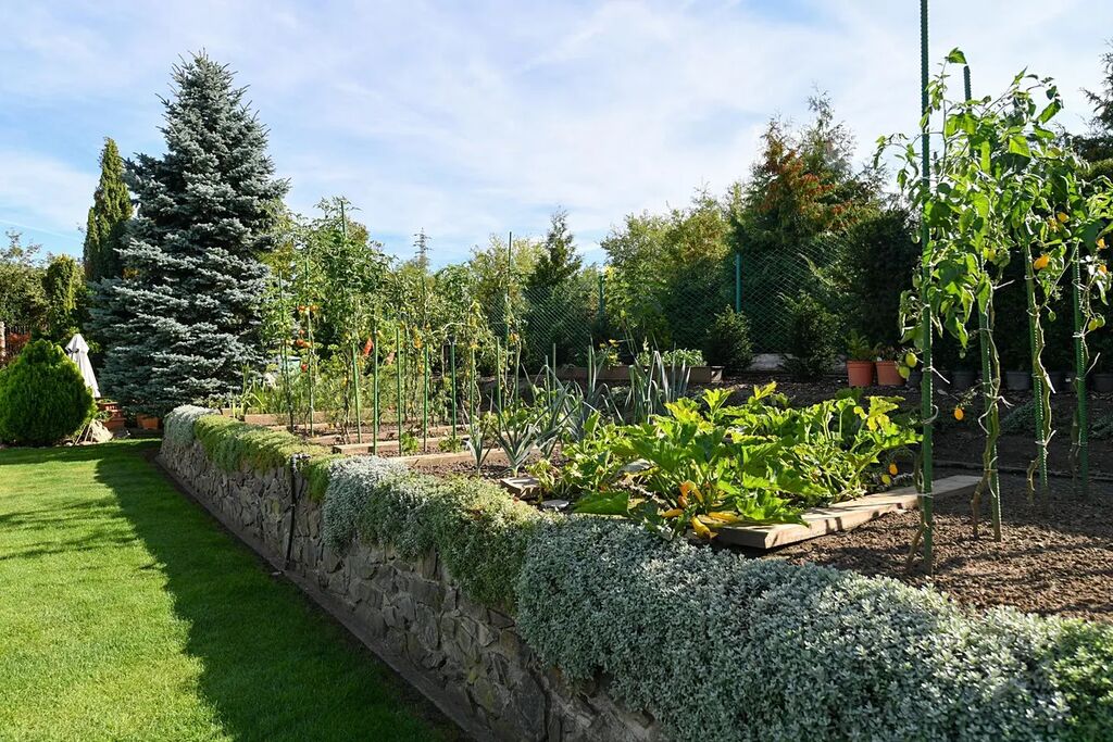 Velkorysá zahrada (1 350 m²) poskytuje dostatek soukromí a na jižní straně nemá přímé sousedy. Krytý a vyhřívaný bazén je využitelný od jara až do podzimu.