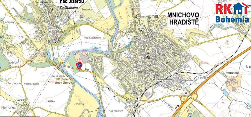 Prodej pozemků, Mnichovo Hradiště, okres Mladá Boleslav. Pozemky o výměře 9.493 m2 se nachází mezi hlavní silnicí č.268 a areálem výrobce nápojů Kofola. Přístup z nového sjezdu ze silnice č.268. Nájezd na D10 pouze 2km. Pozemky nejsou současným územním plánem určeny k zastavění. Bližší informace telefonicky.