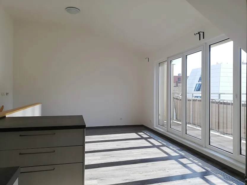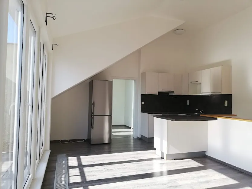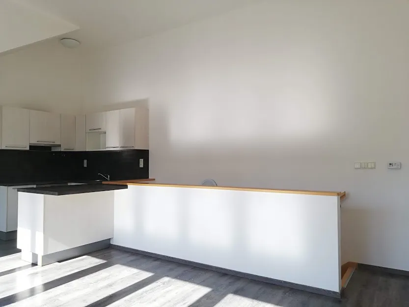 Byt se pronajímá nezařízený, ale vybaven kuchyňskou linkou se spotřebiči (horkovzdušná el. trouba, sklokeramická varná deska, odsavač par, myčka, kombinovaná lednice. V dolní části bytu je umístěna koupelna s vanou, umyvadlem, toaletou a přípojkou na pračku (ta není součástí pronájmu). Vedle je pokoj, kde je možnost prostoru na uložení věcí (pod schody) a z chodby se vchází po schodech do velké obývací části, kde je umístěn kuchyňský kout. Tento horní prostor disponuje dalším pokojem se zkosenými okny. Slunná terasa je přes celou obývací část s hezkým výhledem , kde je dostatek místa na květiny/bylinky a v neposlední řadě určena k posezení směrem do vnitrobloku s možností příjemné a klidné relaxace. Na podlahách byla použita plovoucí podlaha, dlažba. K bytu náleží sklepní koje. Byt je vhodný pro pár, rodinu s dětmi, nebo spolubydlení . V okolí je veškerá občanská vybavenost : Lidl, menší obchody, kavárny, sport centrum Squash Holešovice, golfové hřiště (driving range) Rohanský ostrov, Galerie DOX, známá Pražská tržnice a mnoho divadel a hudebních klubů – SaSaZu, La Fabrika , Rock Opera a mnoho dalších možností. V blízkosti je cyklostezka vedoucí do Troje a přes Libeňský most pokračující do Vysočan a Hloubětína.