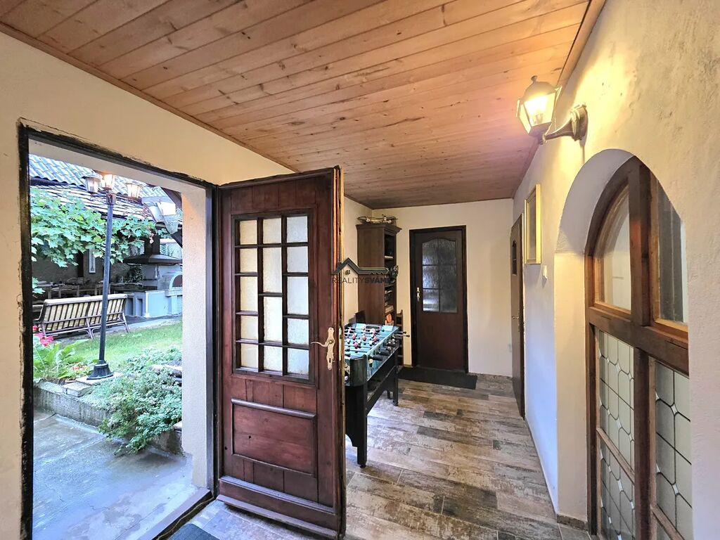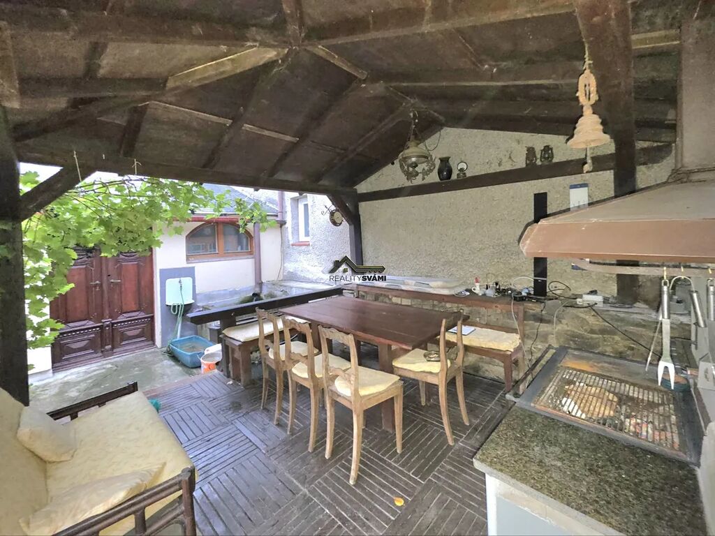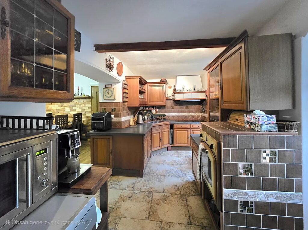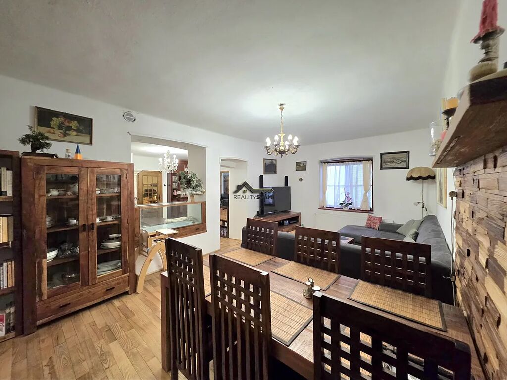 Přízemí kompletně rekonstruováno, obyvatelné a ve velmi dobrém stavu, dispozice: předsíň, společenská místnost s krbem průchozí ze dvou stran, z pravé strany přes ložnici, z levé strany propojená s obývacím pokojem a jídelnou, zde jsou dveře do garáže. Dále se přes obývací pokoj s jídelnou dostanete do prostorné