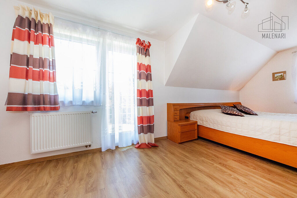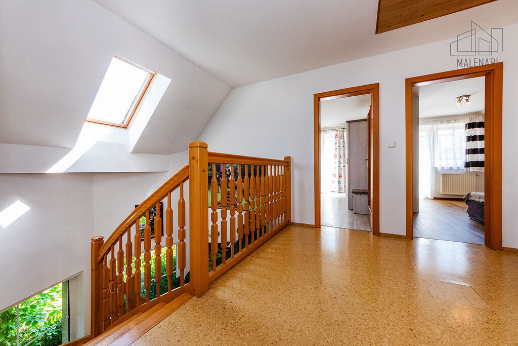 Z prosvětlené haly se po schodech dostaneme do prvního patra, kde jsou dva dětské pokoje (každý cca 15 m²), ložnice (cca 19,7 m²), koupelna (cca 8,2 m²) a samostatná toaleta (cca 2,2 m²). Ložnice má balkon se západní orientací (cca 4,6 m²) a dětské pokoje mají vstup na společnou terasu s jižní orientací (cca 19,1 m²).