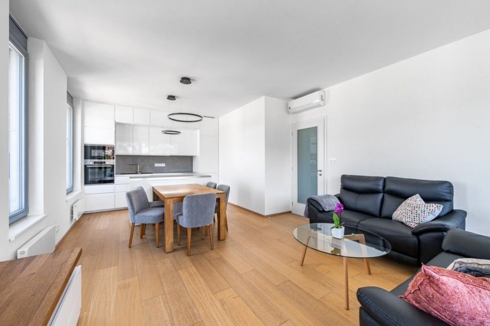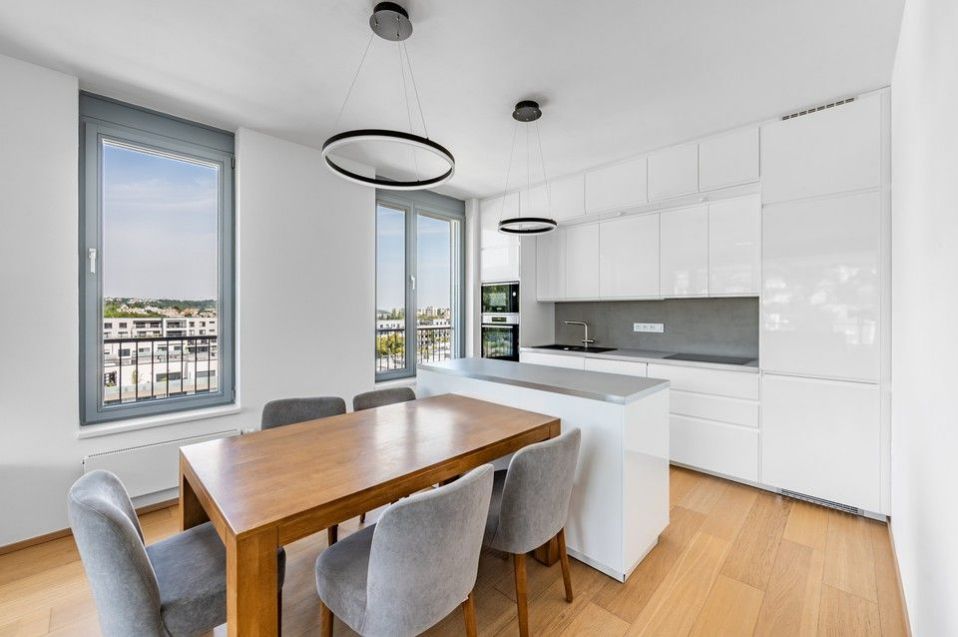 Velkorysá dispozice bytu 4+kk zahrnuje otevřený rohový prostor obývacího pokoje s kompletně vybavenou kuchyní se všemi spotřebiči a obývací částí s přímým vstupem na balkon, 3 samostatné ložnice ( z nichž jedna má přímý výstup na balkon), vstupní chodba, prostorná koupelna s vanou, samostatná toaleta s umyvadlem zvlášť, šatna, podlahové vytápění v koupelně. K dispozici sklep.