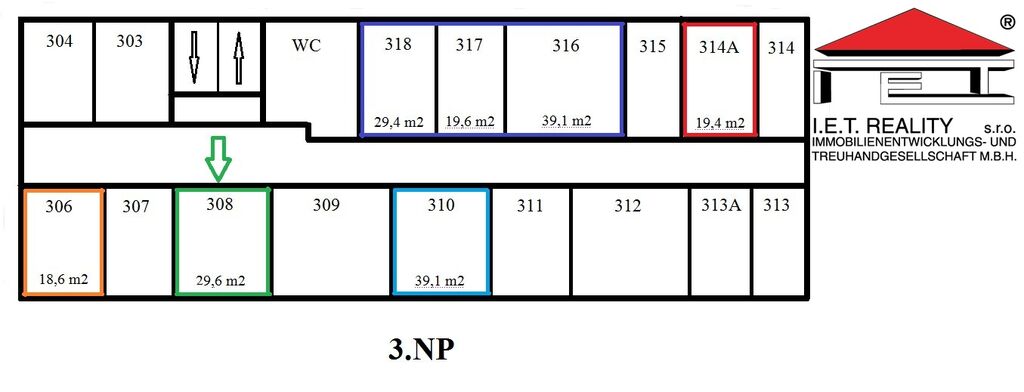 Pronájem kanceláře č. 308, 29,6 m², situované ve 3.NP komerční budovy na ul. Kroftova v Brně. Jedná se o jednu samostatnou místnosti s přímým vstupem a vlastnímpřívodem vody s umývadlem. Jednotka je vybavena skříněmi. V rámci podlaží je k dispozici sdílené sociální zařízení s kuchyňkou. Kancelář má vlastní zabezpečovací okruh s přístupem 24/7 a k pronáimu je volná ihned. Možné je využívat také omezenou kapacitu parkovacích míst.