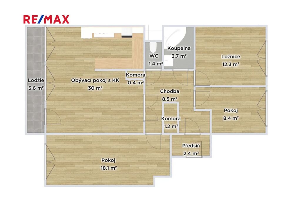 Dispozici bytu tvoří obývací pokoj s kuchyňským koutem a vstupem na lodžii, tři samostatné ložnice, koupelna s vanou, samostatné WC, dvě komory, chodba a předsíň. Byt prošel v roce 2012 kompletní rekonstrukcí, během které došlo ke zděnému vybudování jádra, výměně elektroinstalace v kuchyni, koupelně, WC a obývacím pokoji, položení nových podlah, nové omítky, výmalbě, stropních podhledů a instalaci kompletně vybavené kuchyňské linky. V roce 2021 byl kompletně zrekonstruován pokoj orientovaný východ. Na celé západní straně bytu a jednoho pokoje na východní straně jsou na oknech el. ovládané předokenní rolety. Vytápění i ohřev vody jsou zajištěny centrálně v domě.