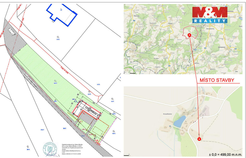 Nabízíme k prodeji atraktivní stavební pozemek o rozloze 1163 m² v klidné části obce Krasoňovice. Tento pozemek je ideální pro realizaci vašeho vysněného bydlení. Již je vyřízeno povolení k výstavbě rodinného domu typu bungalov, včetně projektu s energetickým štítkem A, který zaručuje nízkou energetickou náročnost budoucího domu. Pozemek je připraven k okamžité výstavbě a nabízí veškeré potřebné inženýrské sítě: elektrický proud 230/400 V, vlastní vrtanou studnu a povolení k výstavbě vlastní čističky odpadních vod (ČOV). Tato nemovitost je ideální volbou pro ty, kteří hledají klidné bydlení s výbornou dostupností a kompletními přípravami pro výstavbu. Nepropásněte tuto jedinečnou příležitost.