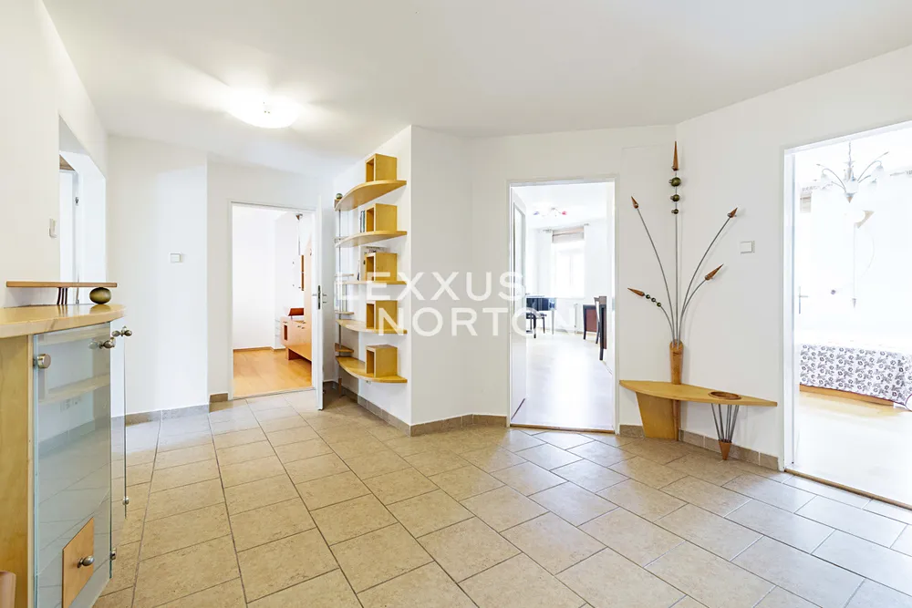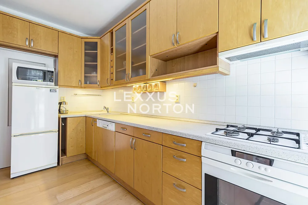 Tento zařízený byt 3+kk o velikosti 108 m2 nabízí k užívání vstupní chodbu s vestavěnými skříněmi, 2 ložnice, z nichž jedna se dá využít také jako pracovna, obývací pokoj s plně vybaveným kuchyňským koutem (sporák, trouba, lednice, mrazák, myčka nádobí, mikrovlnná trouba) a jídelním koutem. Dále koupelna (vana, sprcha, toaleta a pračka) a samostatná toaleta. Byt disponuje velkým množstvím úložných prostorů, obě sedací soupravy je možné rozložit na dvojlůžka.