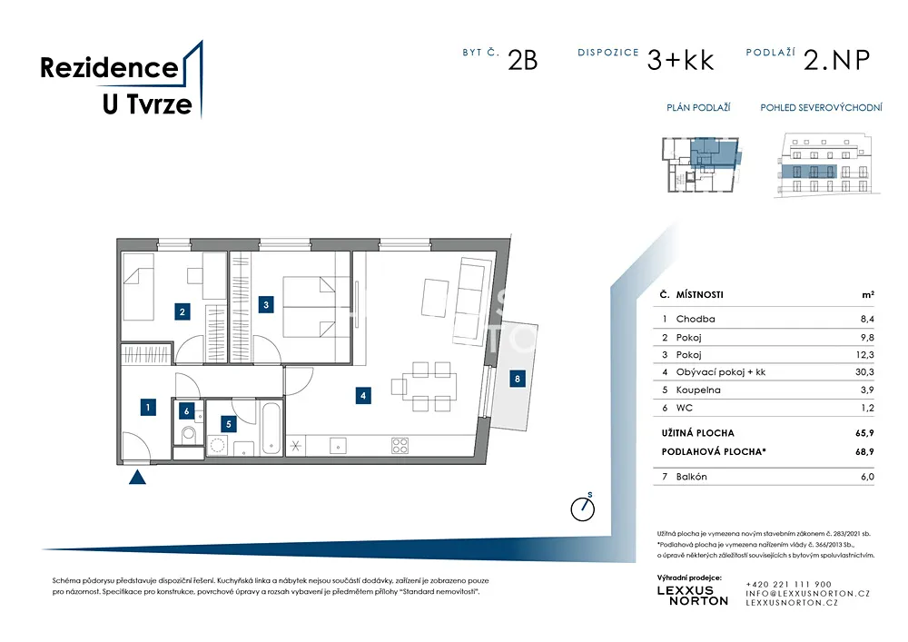 Byt 3+kk o celkové ploše 68,9 m² s prostorným balkonem (6 m²), sklepem a možností garážového stání se nachází ve 2. podlaží Rezidence U Tvrze v Malešicích. Projekt spojuje moderní technologie, vysoký komfort a lokalitu obklopenou zelení.