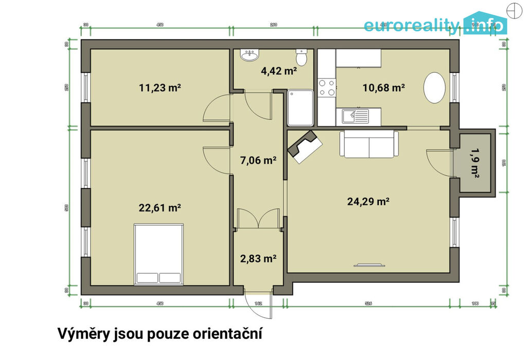 Vytápění je řešeno elektrickými přímotopy, ohřev vody bojlerem s možností napojení na dálkový rozvod.