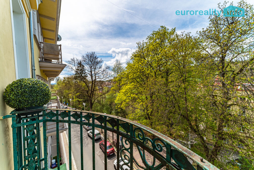 Z balkonu si můžete vychutnat klidný výhled do zeleně lázeňského parku, ideální místo pro ranní kávu či večerní odpočinek.
