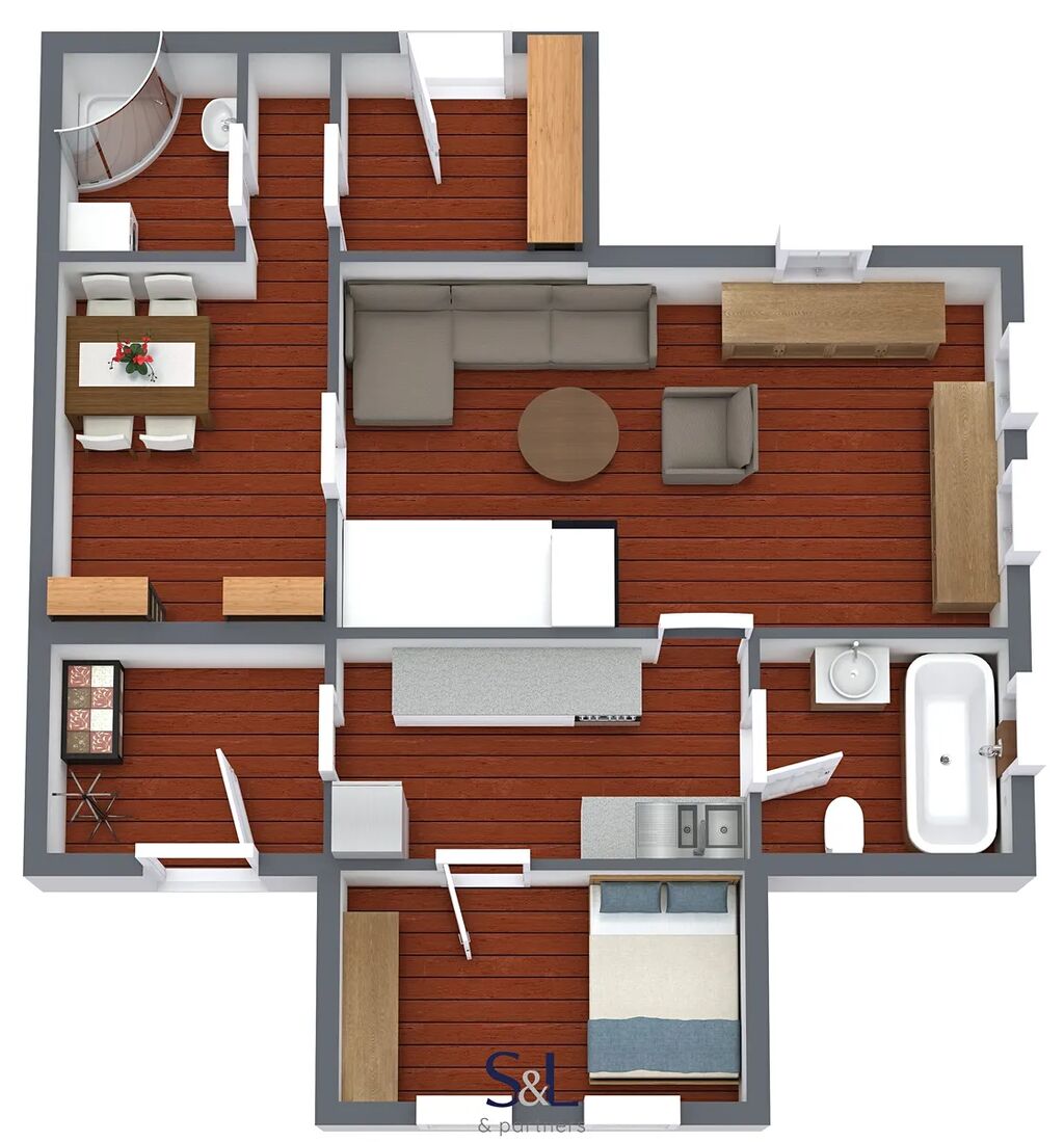 - podlahy: plovoucí podlaha, v koupelnách a kuchyni dlažba