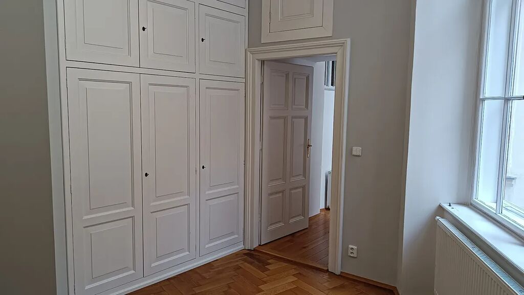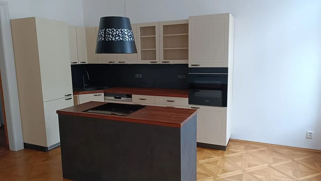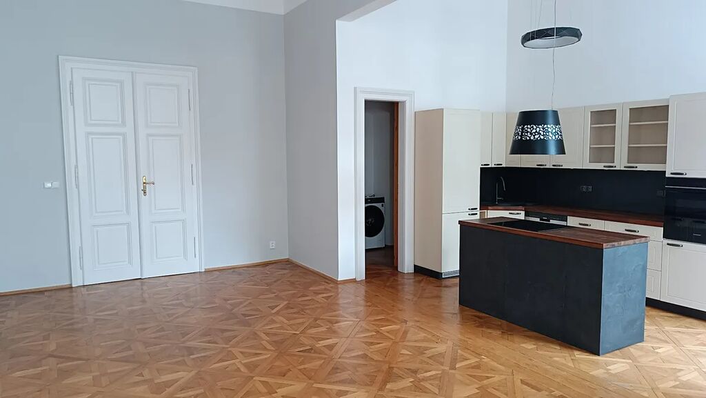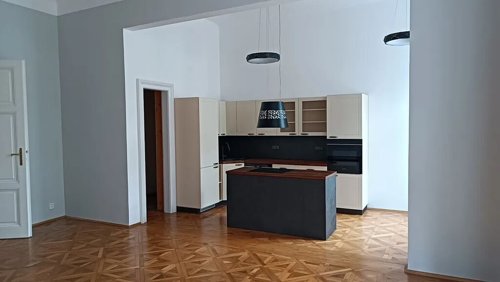 Nabízíme k pronájmu prostorný, luxusní byt 3+kk o výměře 125 m2, po kompletní rekonstrukci ve druhém nadzemním podlaží cihlového domu s výtahem ve Vodičkově ulici v Praze 1. Byt tvoří obývací pokoj s kuchyňským koutem, který má okno, dva neprůchozí pokoje, dvě koupelny z nichž jedna je s vanou, druhá se sprchovým koutem a samostatné WC s umyvadlem. Je zařízený novou kuchyňskou se spotřebiči – sklokeramická deska, elektrická trouba, lednice s mrazákem, pračka a šatní skříně v šatně. Velká špaletová okna z obývacího pokoje a kuchyně jsou orientovaná do Vodičkovy ulice, okna z obou pokojů jsou do klidného vnitrobloku. Na podlahách jsou v pokojích a v předsíni parkety, v koupelně a na WC je dlažba. Topení a ohřev vody je zajištěn vlastním plynovým kotlem. Výborná lokalita v centru Prahy, Václavské náměstí je cca 5 minut chůze od domu. Neplatíte provizi RK. Volný od 1.10. 2025.