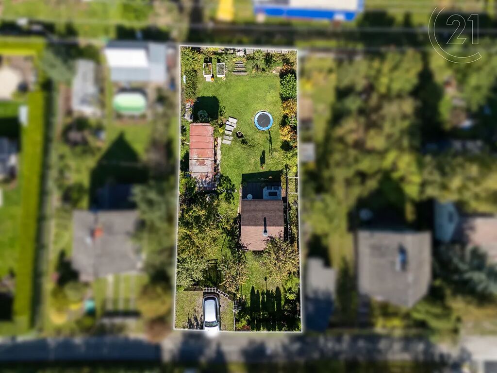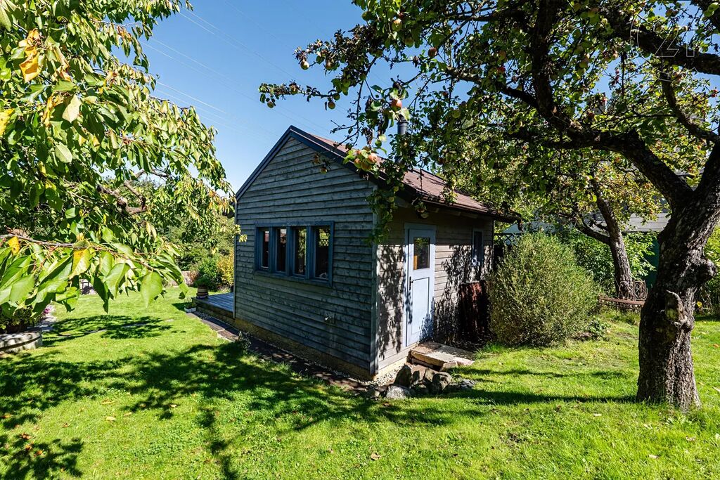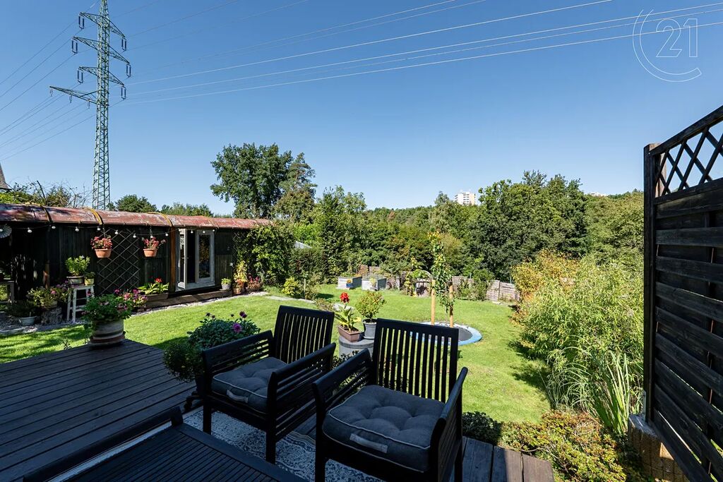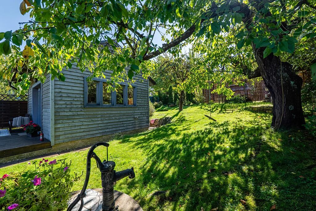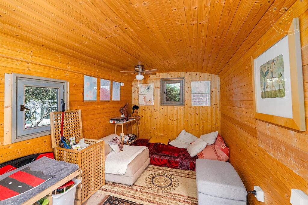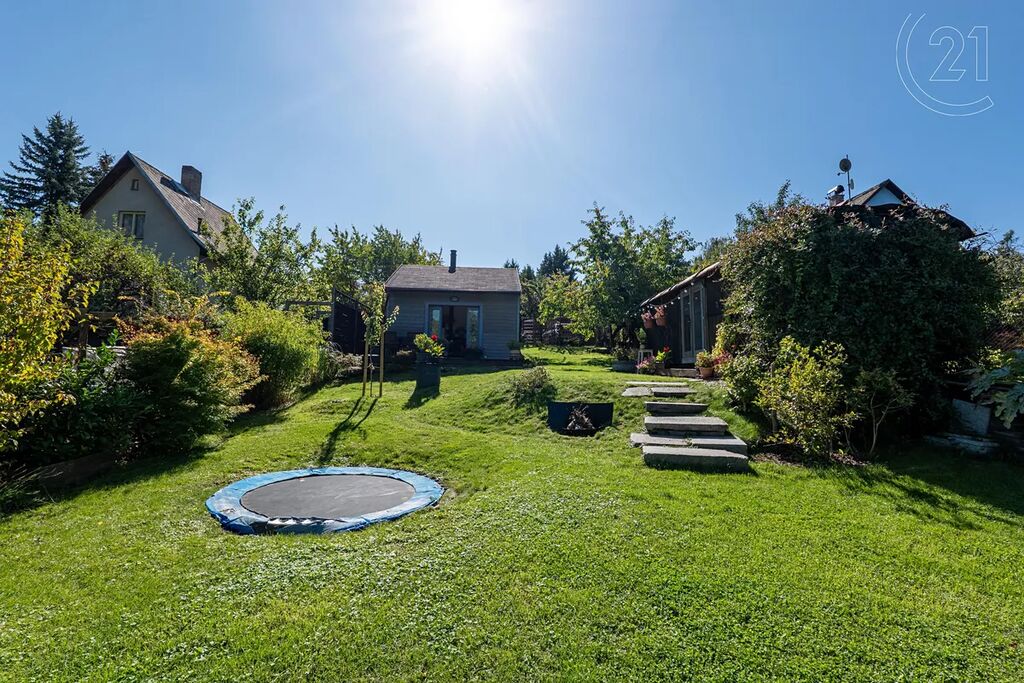 Pozemek slouží jako zahrada a je v mírně svažitém terénu směrem k řece. Automatická sekačka zajistí stále posekaný terén. Vzrostlé plodinové stromy (jabloně, třešně, švestky) vyvýšené záhony a maringotka, která může sloužit jako doposud (herna pro děti) nebo možnost ubytování pro přátelé.