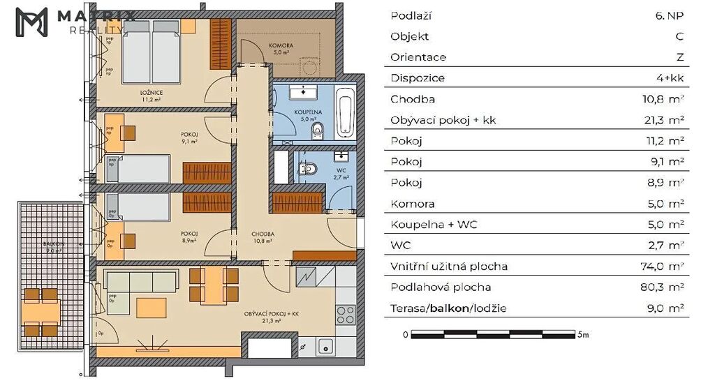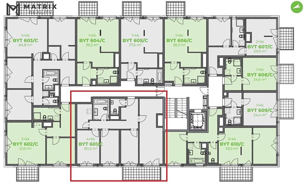 Nabízíme k prodeji světlý byt s dispozicí 4+kk o velikosti 80,3 m s balkonem 9 m. Součástí ceny je také garážové stání a sklepní kóje. Byt je situován na západ, takže si užijete dostatek odpoledního slunce.