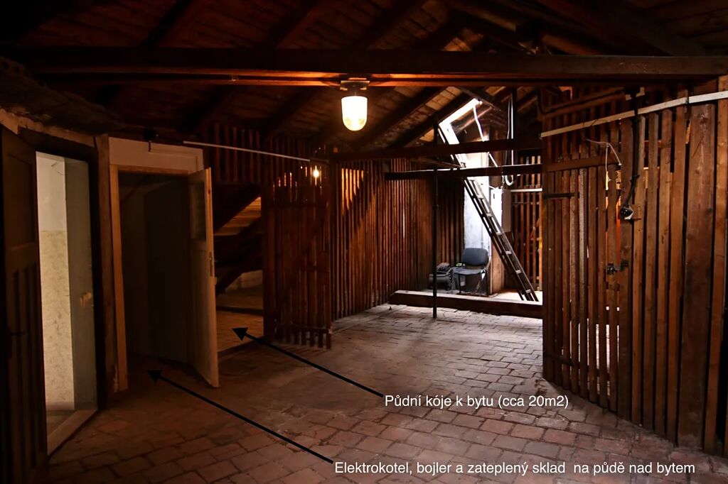 Vytápění zajišťuje elektrokotel včetně ohřevu teplé vody. K bytu náleží dva sklepy na pavlači ( cca 15m2 ) a jeden podkrovní sklep (cca 20m2), který má potenciál k využití do budoucna.
