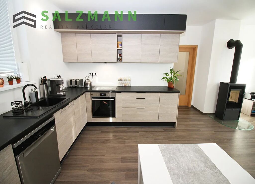 - obývací pokoj s krbovými kamny a otevřenou kuchyní (kuchyňská linka, varná deska, elektrická trouba, myčka) se vstupem na prostornou terasu.