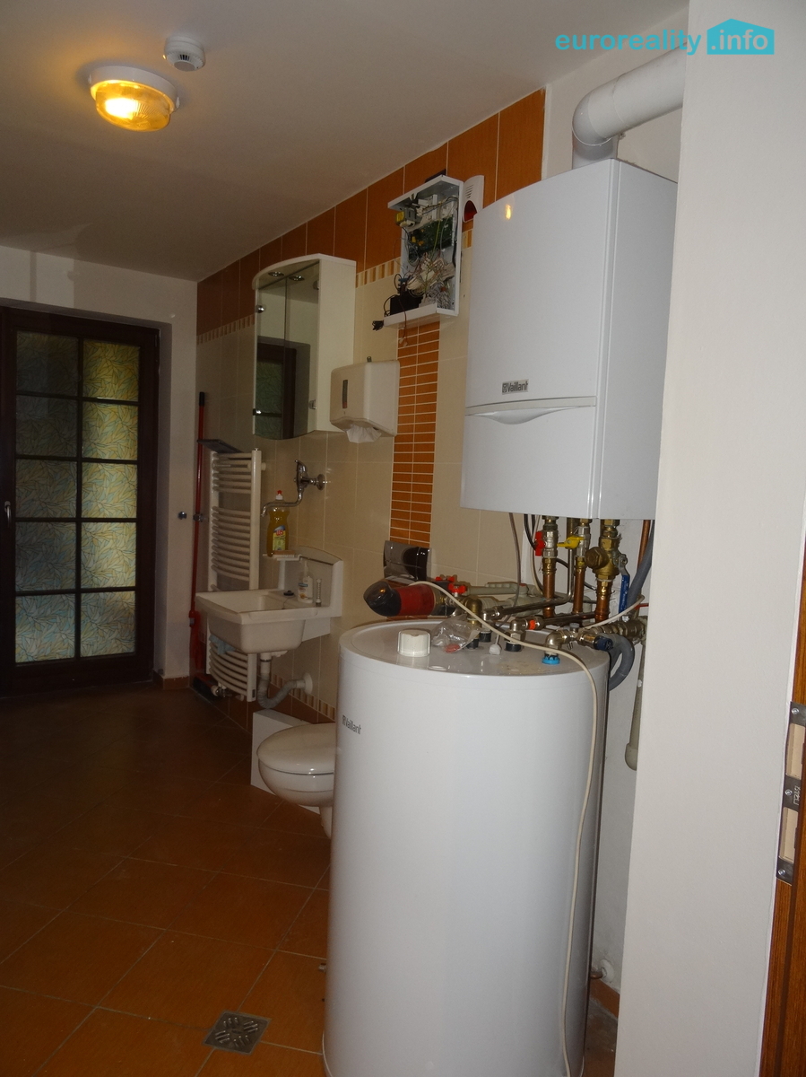 - Přízemí: dvougaráž (39 m²), předsíň, komora, technická místnost s plynovým kombinovaným kotlem, samostatné WC.