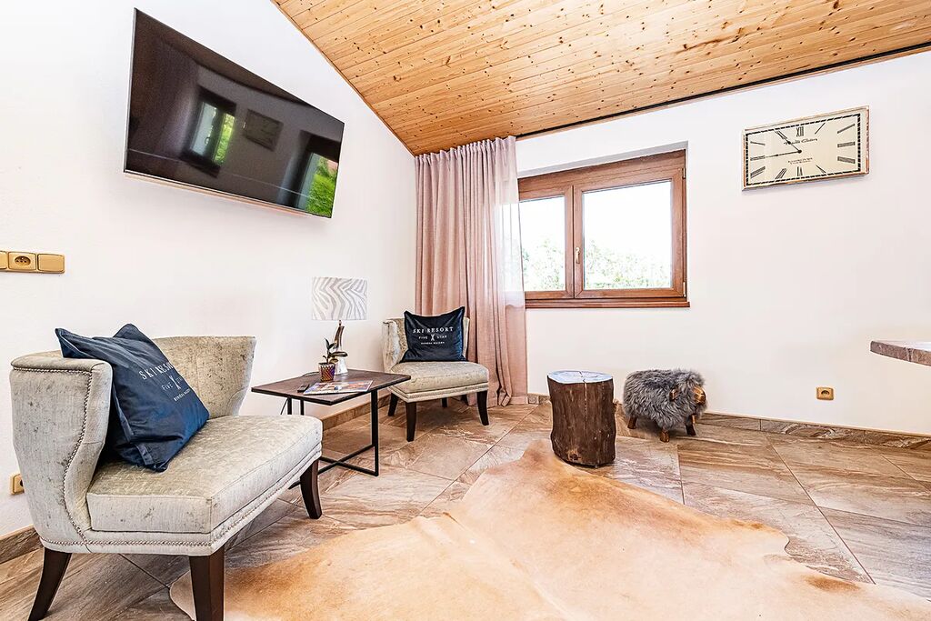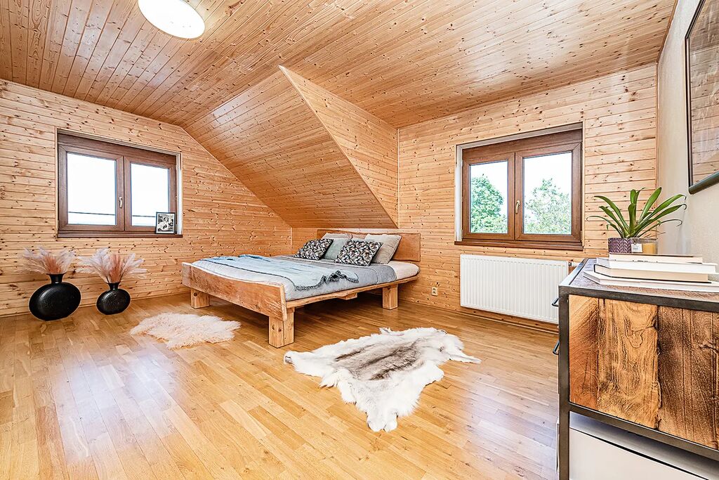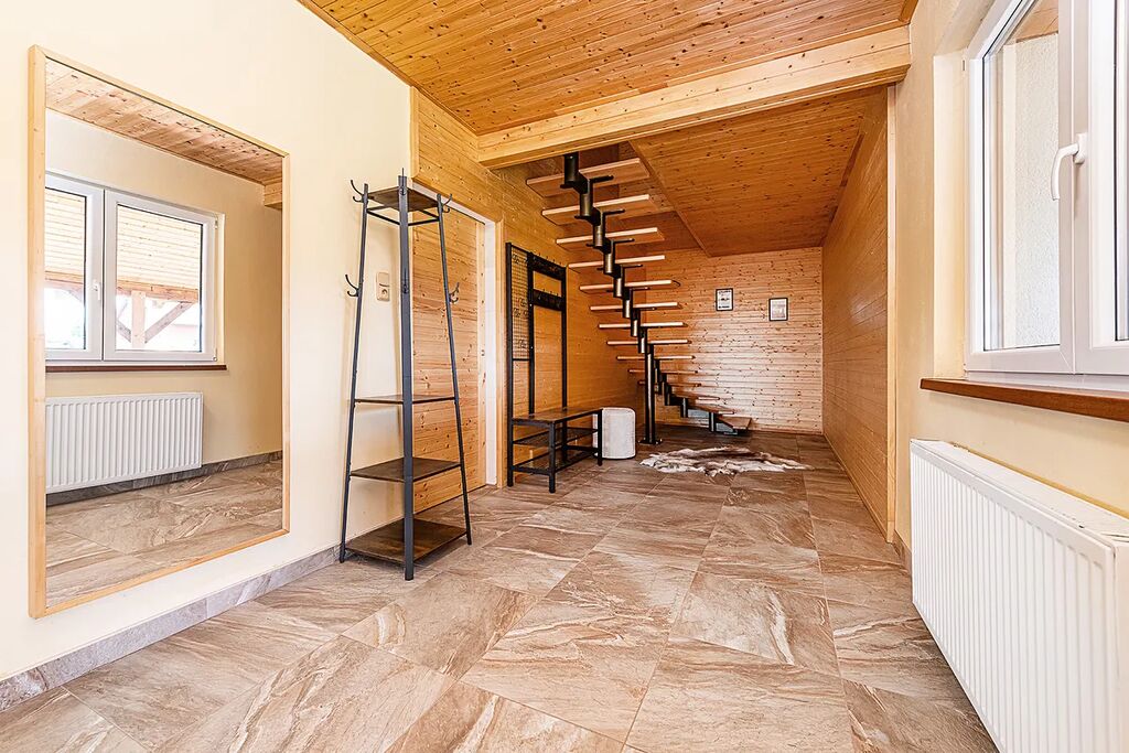 V přízemí se nachází dvě prostorné místnosti, koupelna se sprchou a toaletou a kompletní technické zázemí. Druhé patro tvoří obytná část s kuchyní, dvěma ložnicemi a koupelnou se sprchovým koutem a vanou, toaleta je samostatně. Z druhého patra vede schodiště na půdní galerii s dalšími dvěma menšími pokoji.