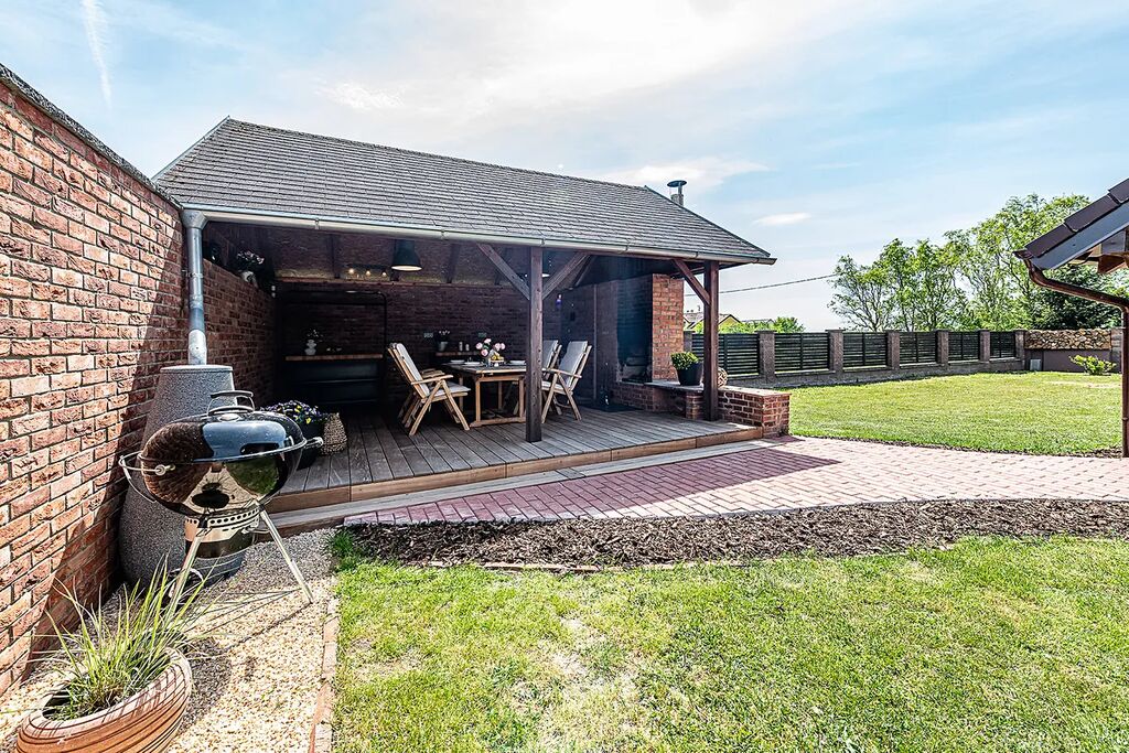 Součástí nemovitosti je zahradní pergola s otevřeným ohništěm a udírnou. Pergola i část oplocení jsou obloženy luxusními lícovými cihlami Brickland a podlaha pergoly je z exotické Garapy, která je odolná a netřískuje.
