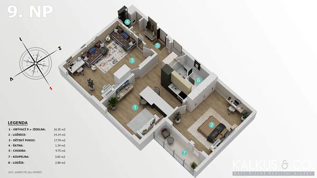 Byt je po částečné rekonstrukci ve velmi dobře udržovaném stavu. V centru dění se nachází obývací pokoj společný s novou kuchyňskou linkou a jídelnou (cca 16.35 m2). Po stranách obývacího pokoje je dětský pokoj (cca 17.79 m2) a ložnice (14.14 m2) s lodžií. V původním jádře je koupelna se sprchovým koutem společná s WC.