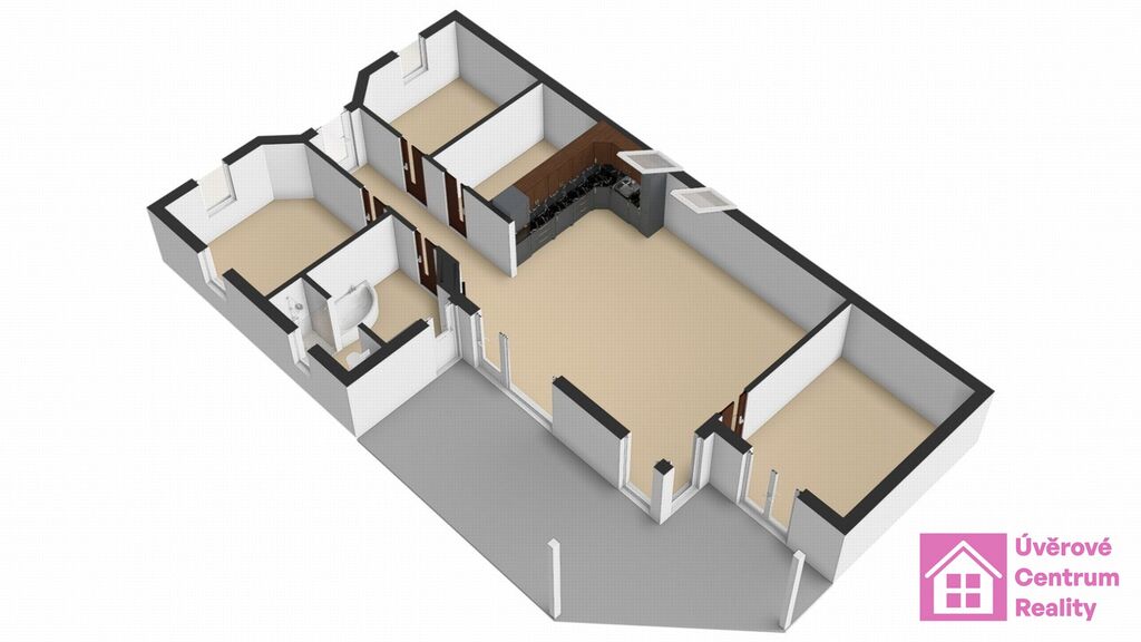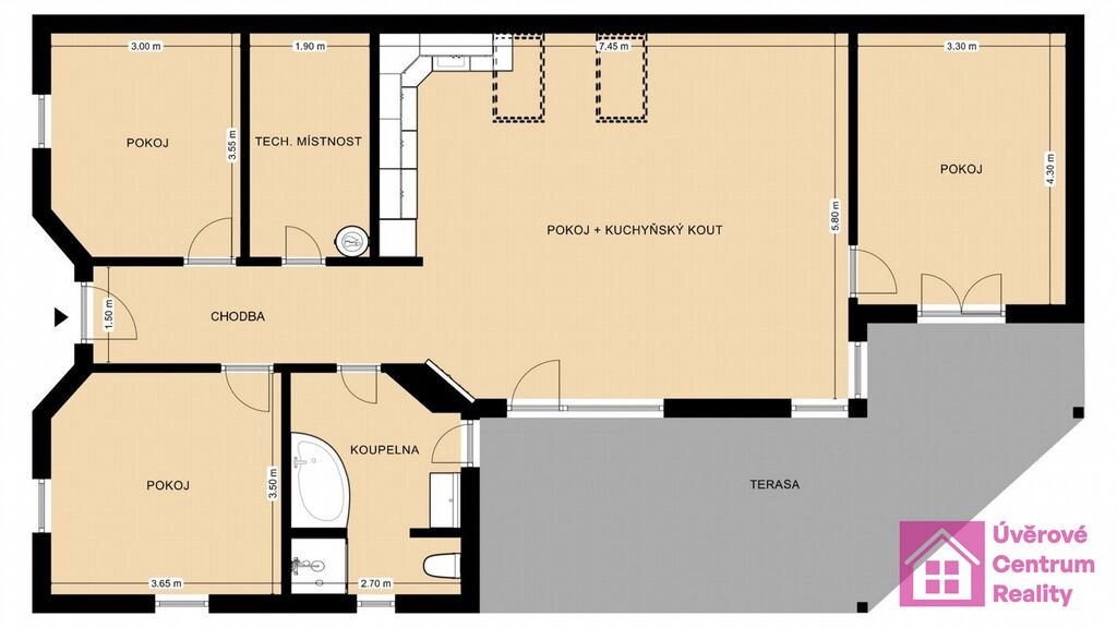 Dispozice: pokoj, chodba, pokoj, technická místnost, koupelna (vana, sprchový kout a toaleta), kuchyňský kout spojený s obývacím pokojem, ložnice a zastřešená terasa. Půdorys domu naleznete ve fotogalerii.