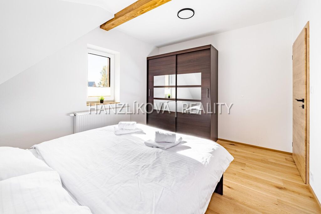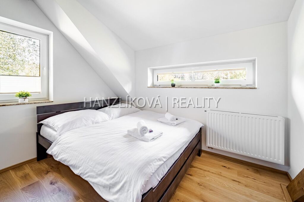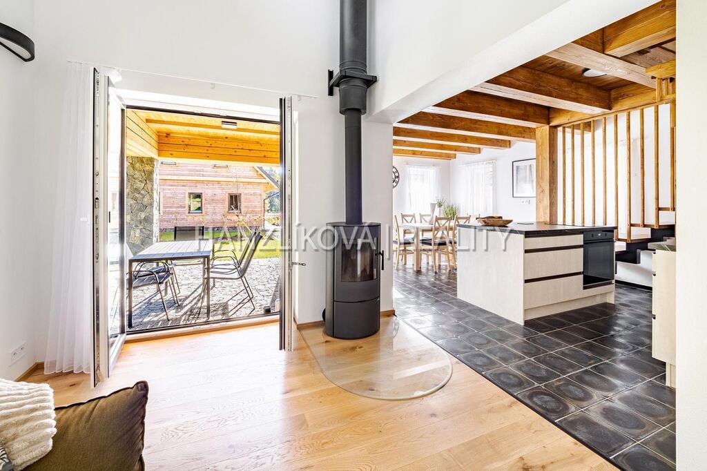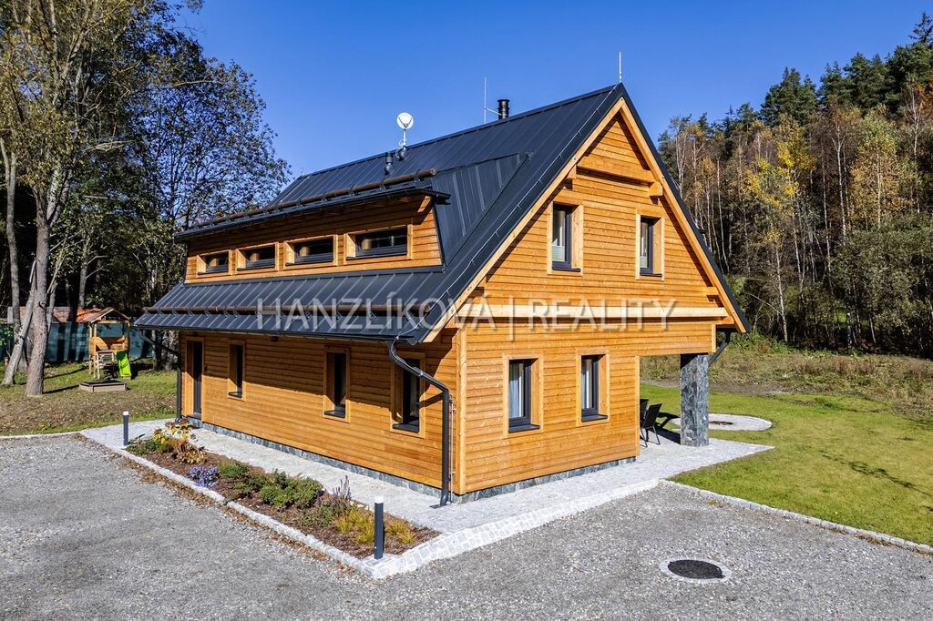 Dům je součástí komorního rekreačního areálu " Venkovské usedlosti Pernek" a byl zkolaudován v roce 2022. Dům stojí na vlastním pozemku o celkové výměře 1381 m2, disponuje užitnou plochou přes 156 m2 a je rozdělen na dvě obytná podlaží. V přízemí se nachází prostorná kuchyně s jídelnou a přímým vstupem na terasu, obývací pokoj s krbem, koupelna a technické zázemí. V podkroví najdete čtyři samostatné ložnice a další koupelnu s WC. Celkově nabízí pohodlné zázemí i pro větší rodinu či rekreační pronájmy. Dům je napojen na el. en. - má vlastní elektrokotel a bojler na ohřev vody, vytápění je podlahové, voda ze společné studny, každý dům má pak svou čističku pitné vody, odpad - septik na vyvážení. Objekt je vybaven moderním systémem vytápění, který lze ovládat pohodlně na dálku prostřednictvím mobilní aplikace. Díky tomu můžete topení zapnout či regulovat ještě před příjezdem a nastavit teplotu v každé místnosti zvlášť podle vlastních potřeb. Dům byl postaven z kvalitních materiálů a zůstává plně vybaven.