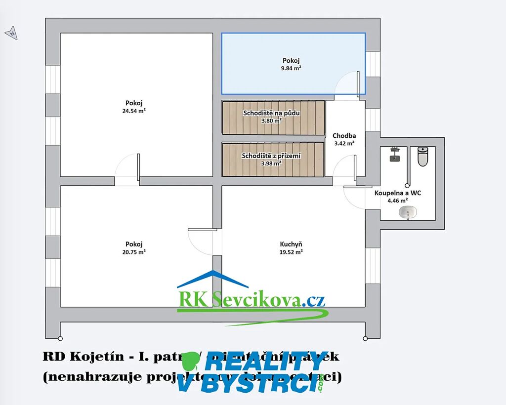 Přízemí: bytová jednotka 2+1, koupelna, WC, CP 86 m2
