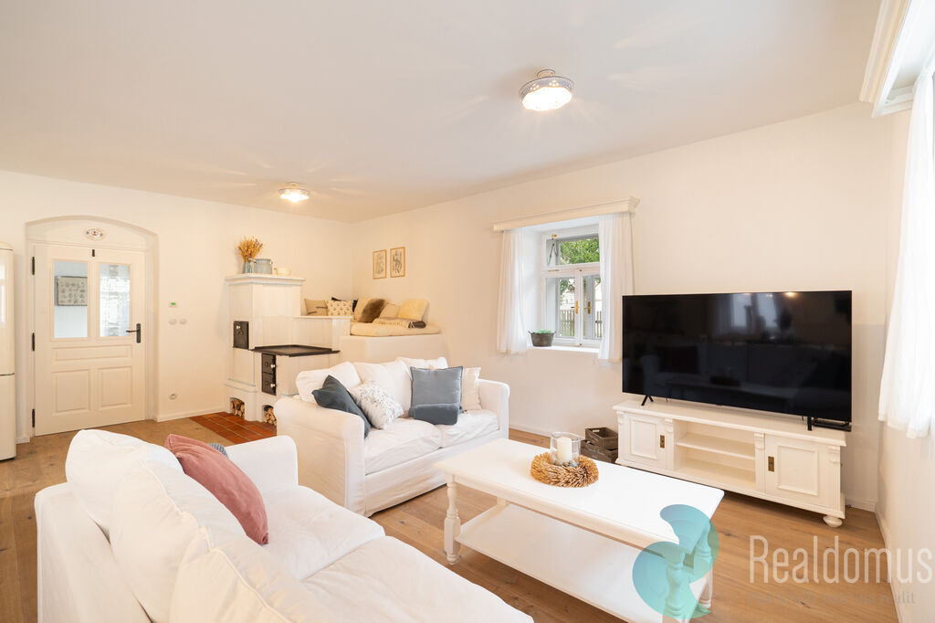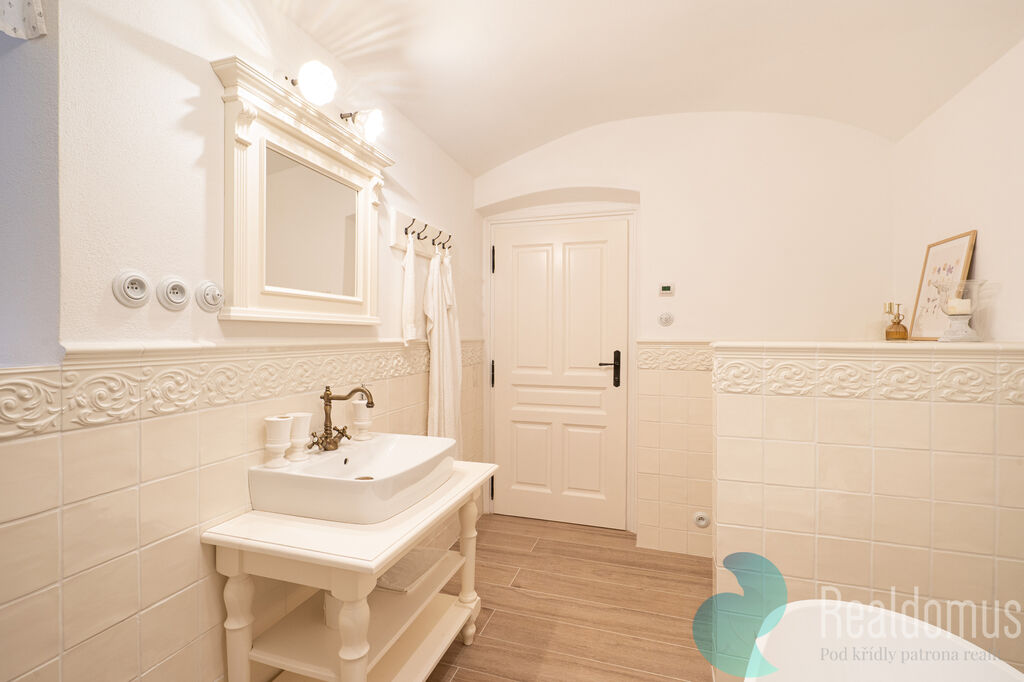 Za zdmi uzavřeného dvora objevíte svět, kde čas plyne pomaleji. V domě se nacházejí tři ložnice, dvě koupelny a prostorná obytná kuchyně, jejíž atmosféru dotvářejí kamna s pecí. Majitelé provedli velmi citlivou rekonstrukci, jejíž podstatou bylo použití tradičních prvků, jako jsou trasvápenné omítky, špaletová okna, dubové podlahy, porcelánové zásuvky a vypínače, ručně vyráběná italská svítidla či retro-sanita, díky nimž si dům uchoval svůj původní historický charakter. Každý detail působí jako malý umělecký šperk – od původního starého dřeva po kvalitní dlažby. Dům je navíc podsklepený a technicky připravený i pro moderní technologie, včetně chytrého ovládání vytápění.