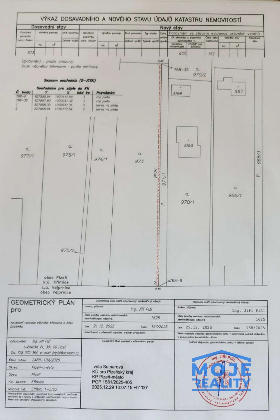 Nabízíme k prodeji stavební pozemek v klidné lokalitě Brůdek u Vejprnic, v katastrálním území Křimice (Plzeň). Celková výměra pozemku je 1 574 m², součástí je také vlastní příjezdová cesta - která není započítána do celkové výměry pozemku o výměře 247 m².