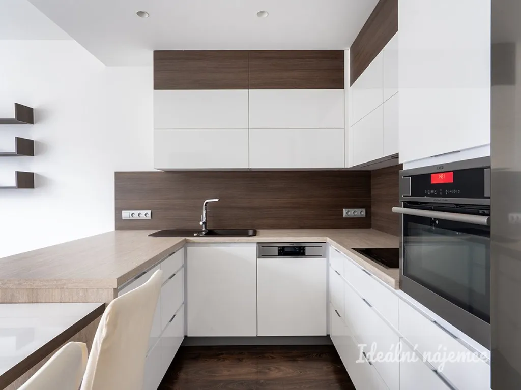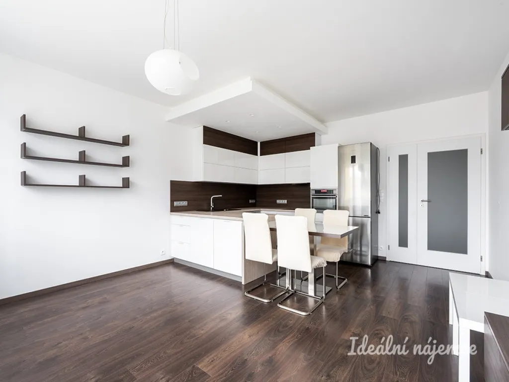 Byt je nabízen částečně vybavený, což dává možnost doladit si interiér podle vlastního vkusu. Moderní kuchyňský kout je vybaven lednicí s mrazákem, elektrickou troubou, indukční varnou deskou, digestoří, myčkou a jídelním stolem s židlemi. Na to navazuje prostorná obývací část, kterou lze zařídit pohodlnou sedací soupravou, TV a dalším nábytkem.