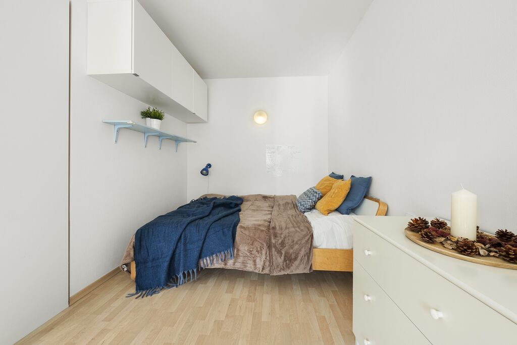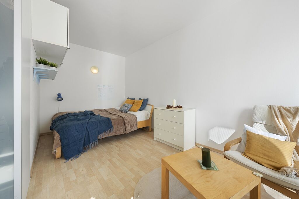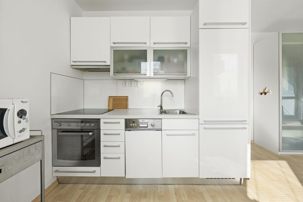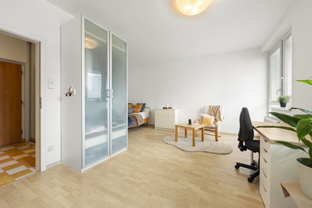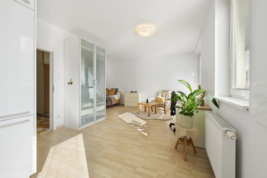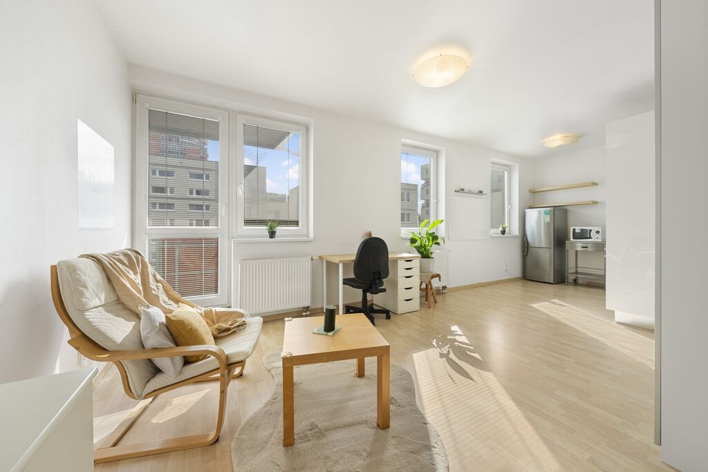 Z předsíně se vstupuje do hlavní obytné místnosti (27,85 m²) s kuchyňským koutem. Kuchyně je vybavená kvalitní linkou v provedení bílý lak se spotřebiči a díky chytrému uspořádání nenarušuje zbytek prostoru. Obývací část je dostatečně prostorná a lze ji pohodlně zařídit sedačkou, jídelním stolem i pracovním koutkem. Praktickým řešením je oddělený prostor za rohem, kde vznikla útulná ložnicová zóna pro postel – byt tak působí spíše jako 2+kk.