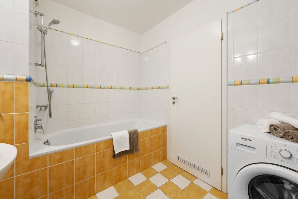 Koupelna s WC (5,16 m²) je prostorná, vybavená vanou, umyvadlem, WC a pračkou. Díky svému uspořádání působí komfortně a funkčně.