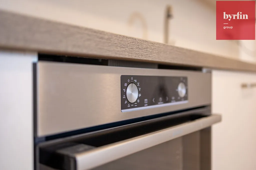 Bytová jednotka sestává ze vstupní předsíně, obývacího pokoje s kuchyňským koutem, ložnicí a koupelnou s WC. Na podlaze je položena laminátová podlaha s dekorem dřeva, která barevně koresponduje s kuchyňskou linkou řešenou na míru. Kuchyňská linka disponuje vestavnou horkovzdušnou troubou , sklokeramickou deskou, digestoří a granitovým dřezem s pákovou baterií. Pracovní plocha je osvětlena LED páskem. Obývací pokoj je dobře prosvětlený denním světlem a také zapuštěnými LED světly, které jsou instalovány v celém bytě a mají minimální spotřebu elektrické energie. Ložnice nabídne dostatek prostoru pro manželskou postel, pracovní stůl a šatní skříně. Koupelna s WC, do které se vchází z ložnice je vybavena rohovým sprchovým koutem, toaletní skříňkou. Pračku je možno připojit do kuchyňské linky.