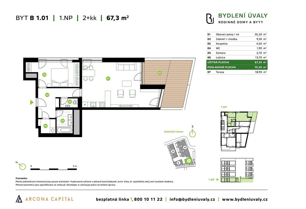 Nabízíme Vám byt 2+kk, 70,2 m² s velkou prostornou terasou 18,9 m², komorou, koupelnou a samostatným WC v projektu Bydlení Úvaly. Byt se nachází v 1. nadzemním podlaží bytového domu B.
